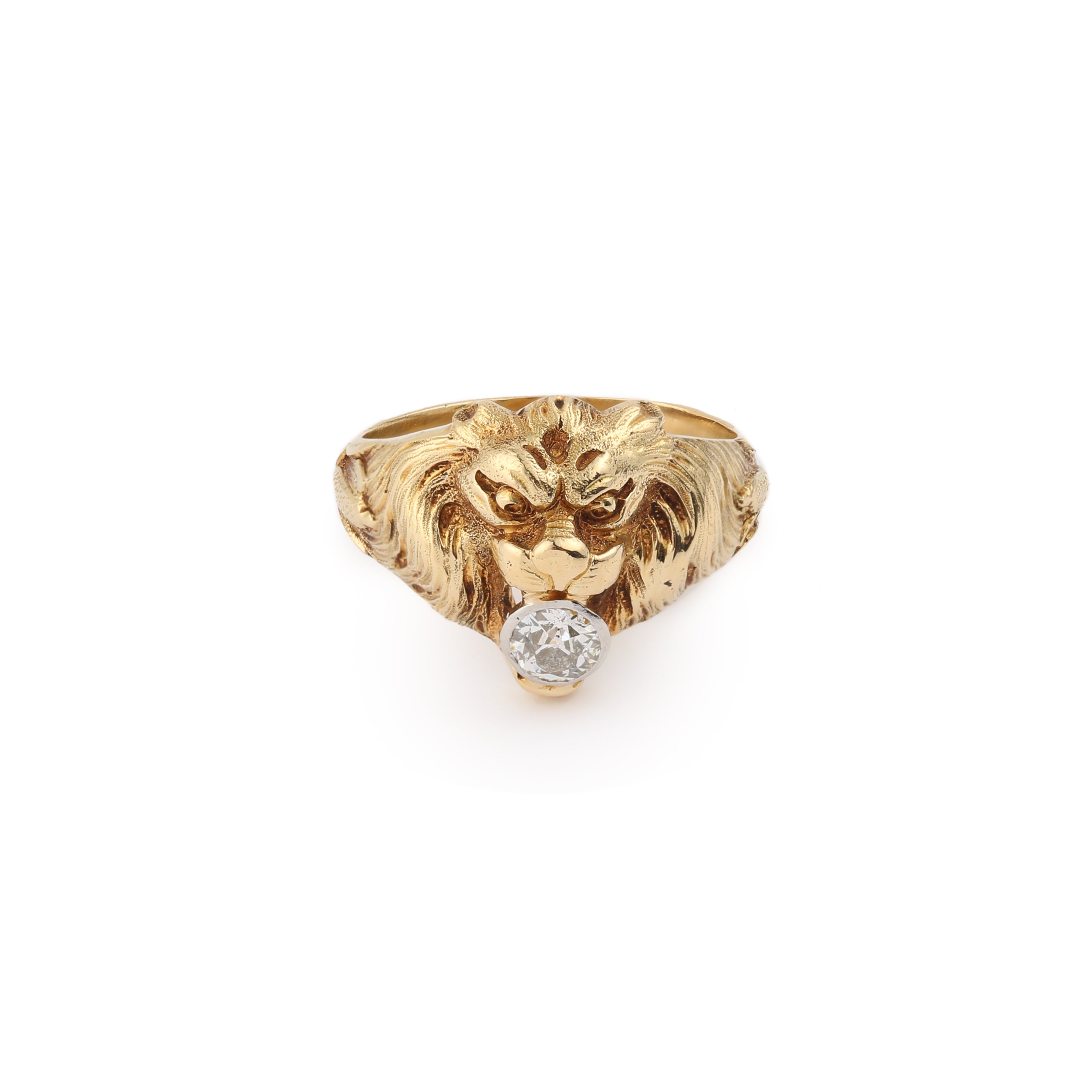 Surprising signet ring with lion figure, its jaw enclosing an old cut diamond.