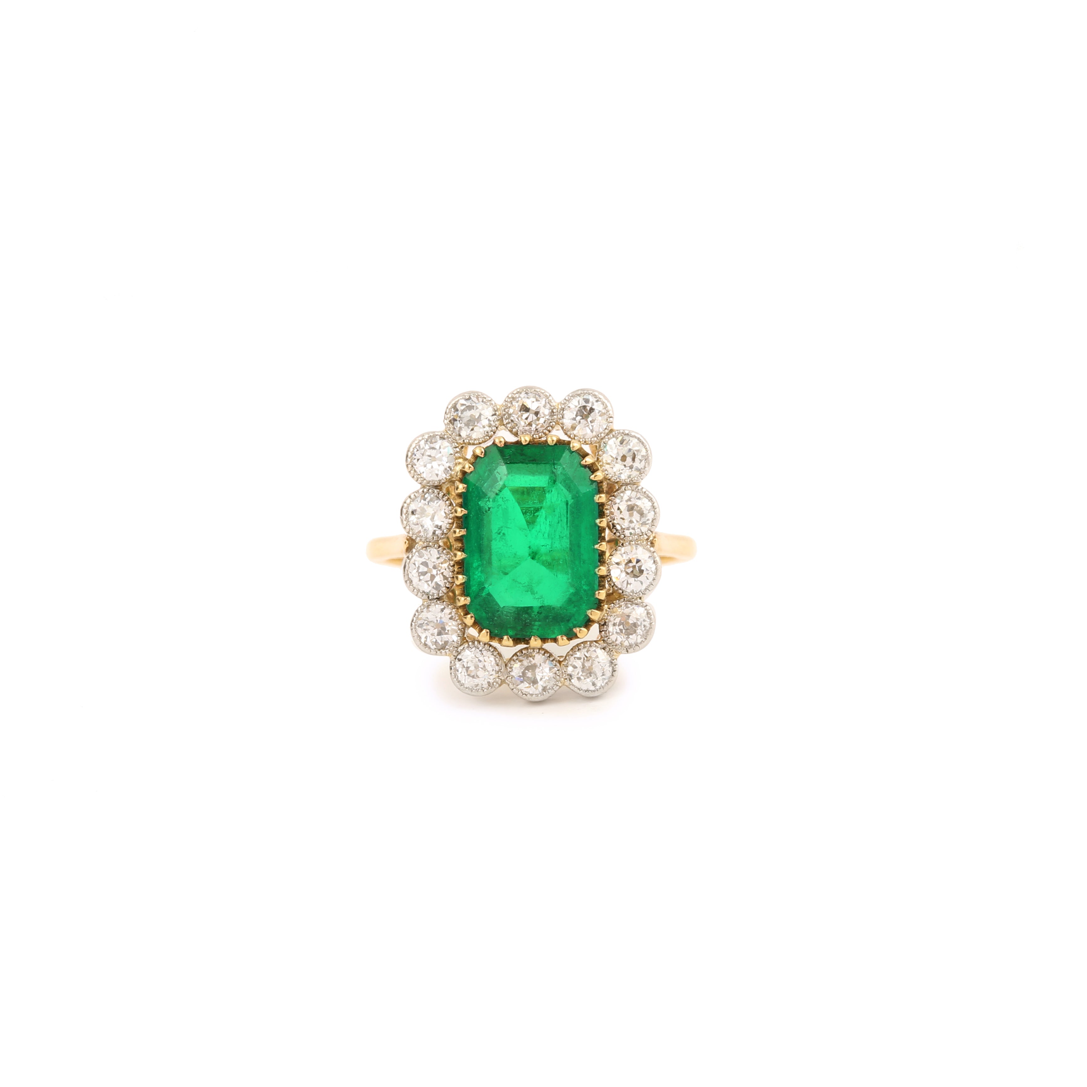Art Deco ring set with an exceptional 3 carats colombian emerald and 14 diamonds.