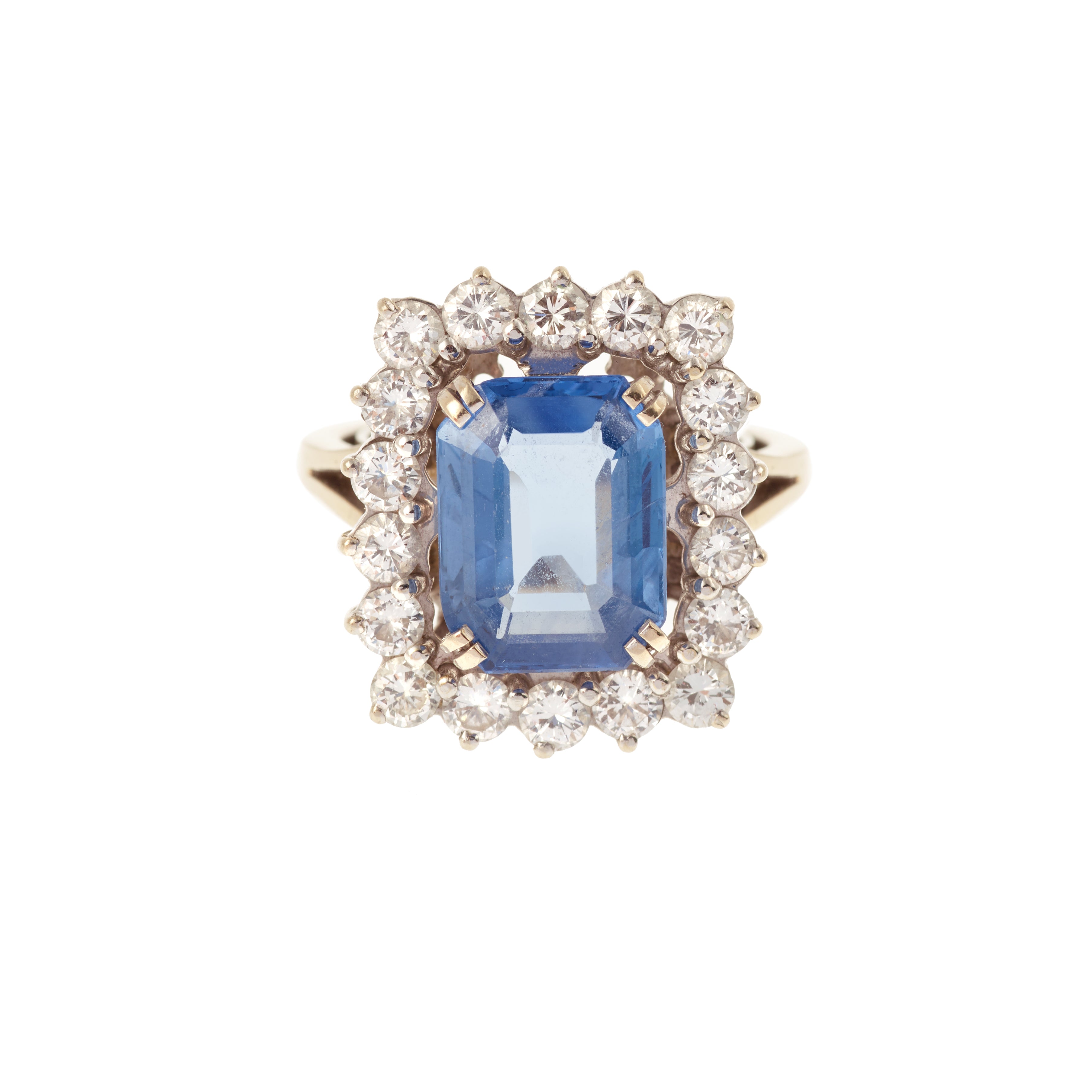 Amazing and exceptional engagement ring set with an Unheated rectangular Burmese Sapphire surrounded by 18 round cut diamonds for a total carat weight of 1.80ct approximately, on a white gold setting 18 K 750/1000th (eagle’s head stamp)