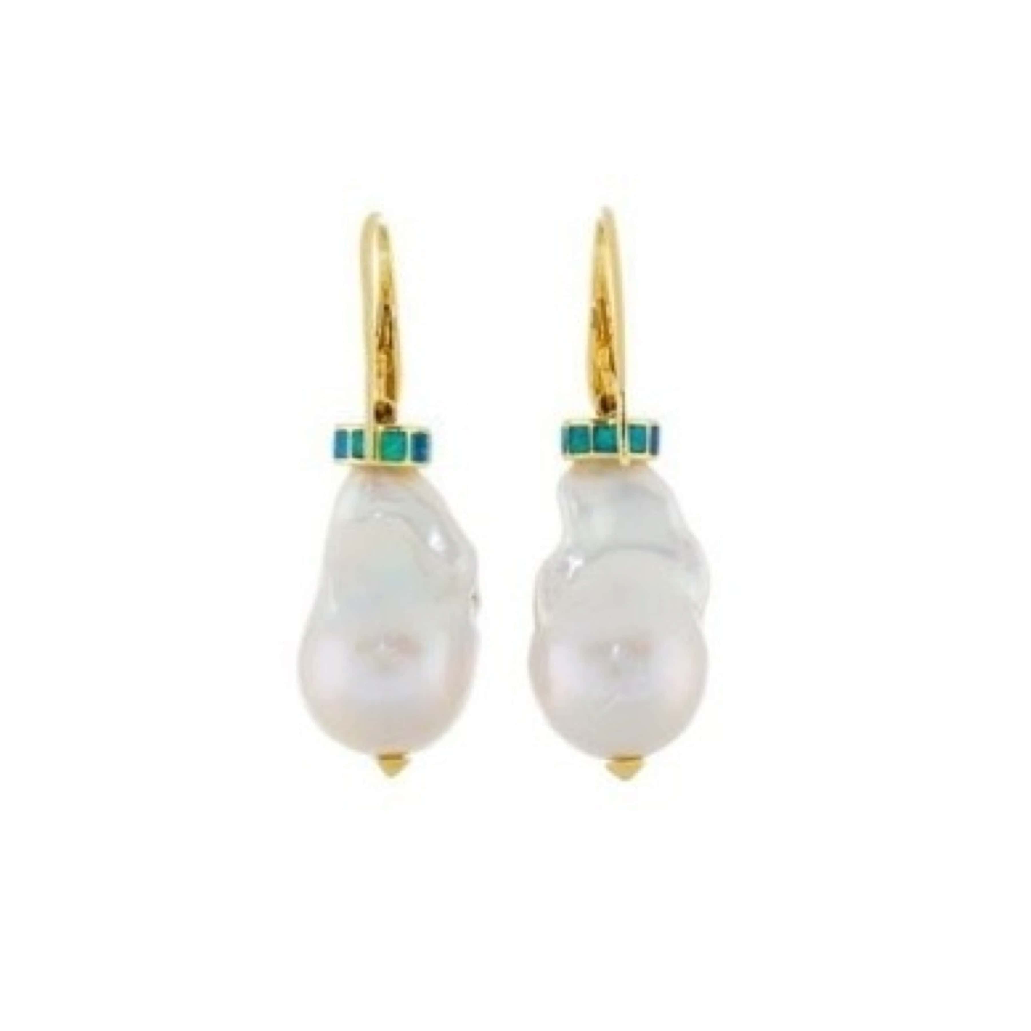 Pair of yellow gold earrings holding baroque cultured pearls topped with small opal squares.