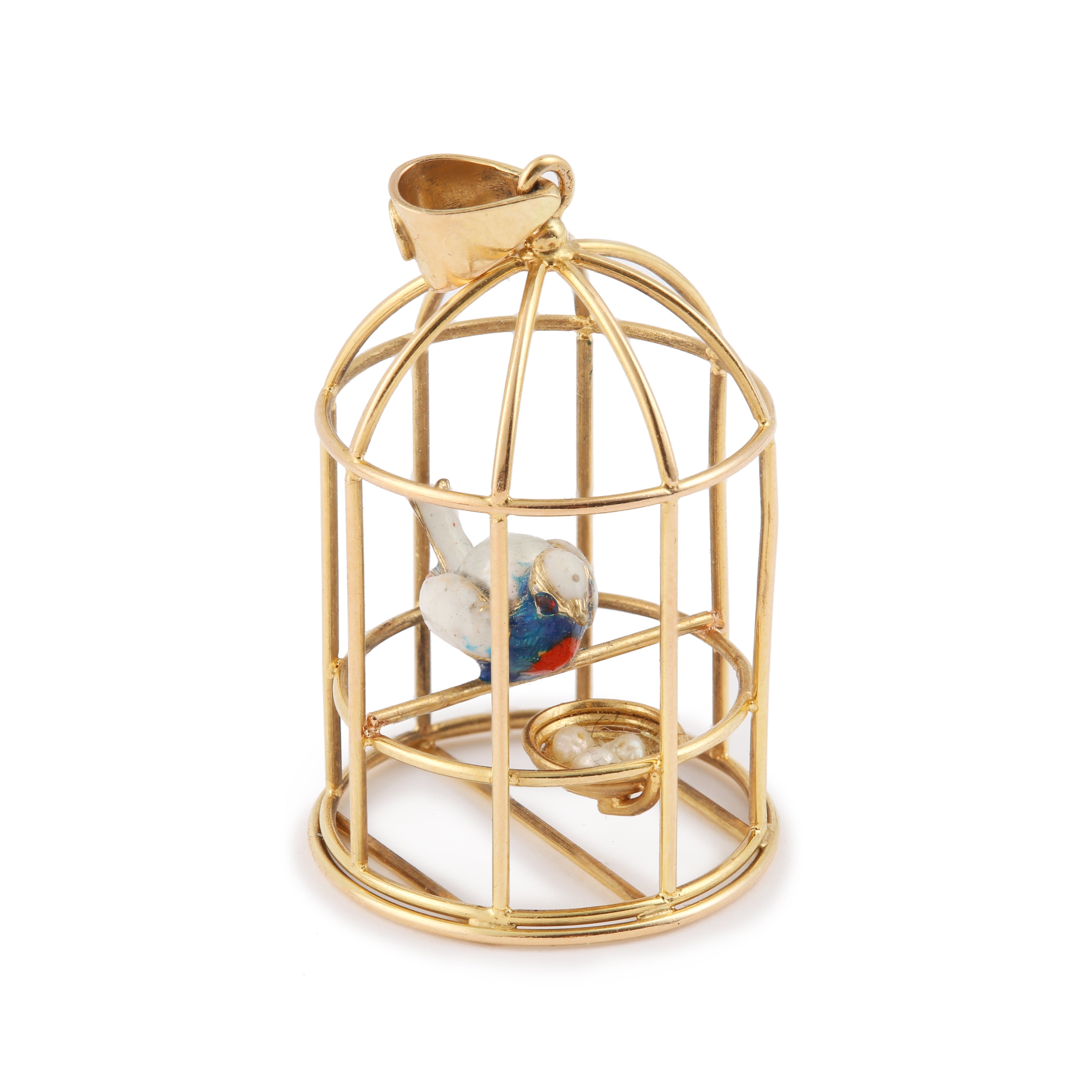 Pendant depicting a yellow gold cage with an enamel and pearl bird guarding its eggs.