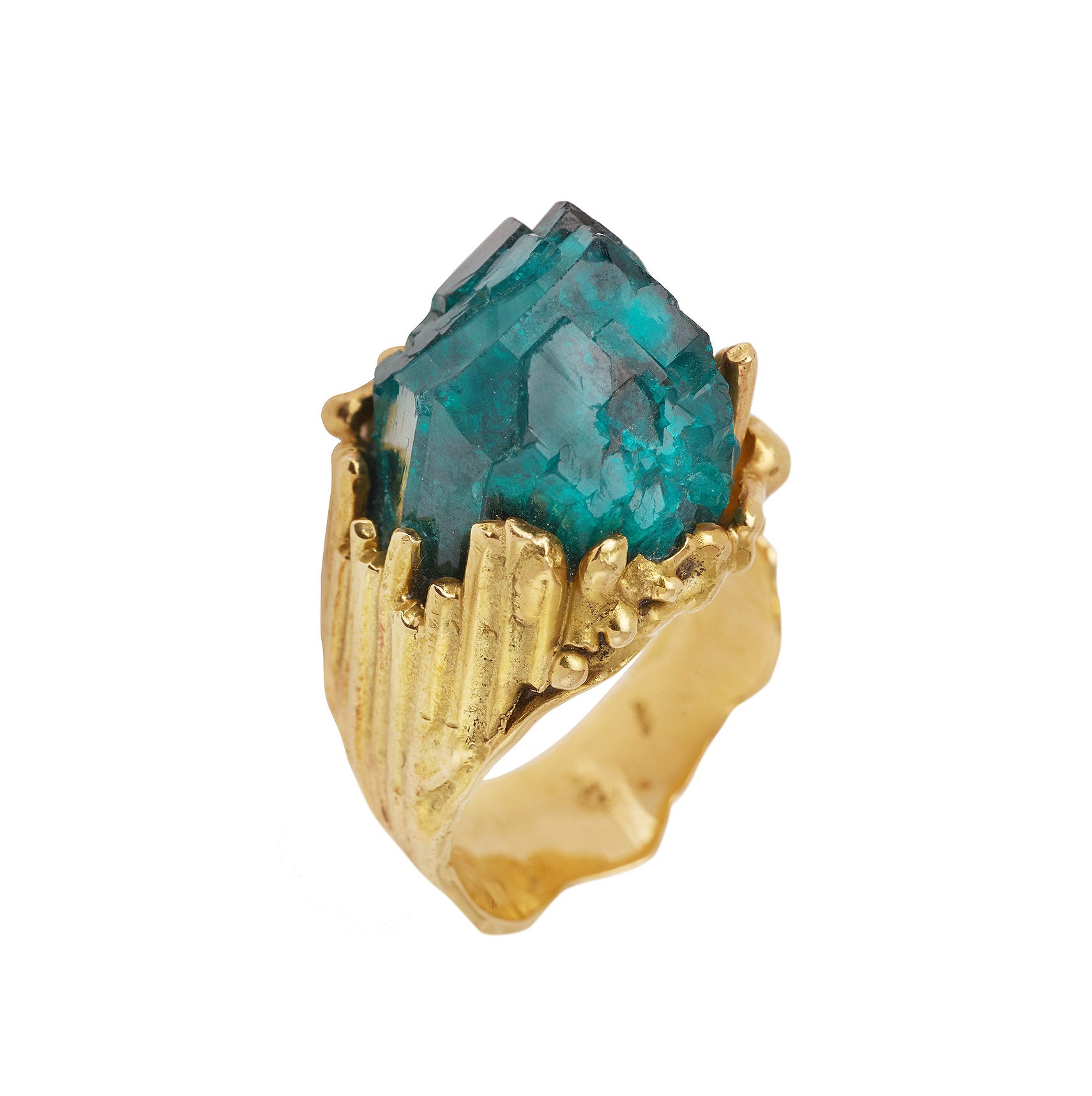 Yellow gold granite ring with raw dioptase crystals in its center.