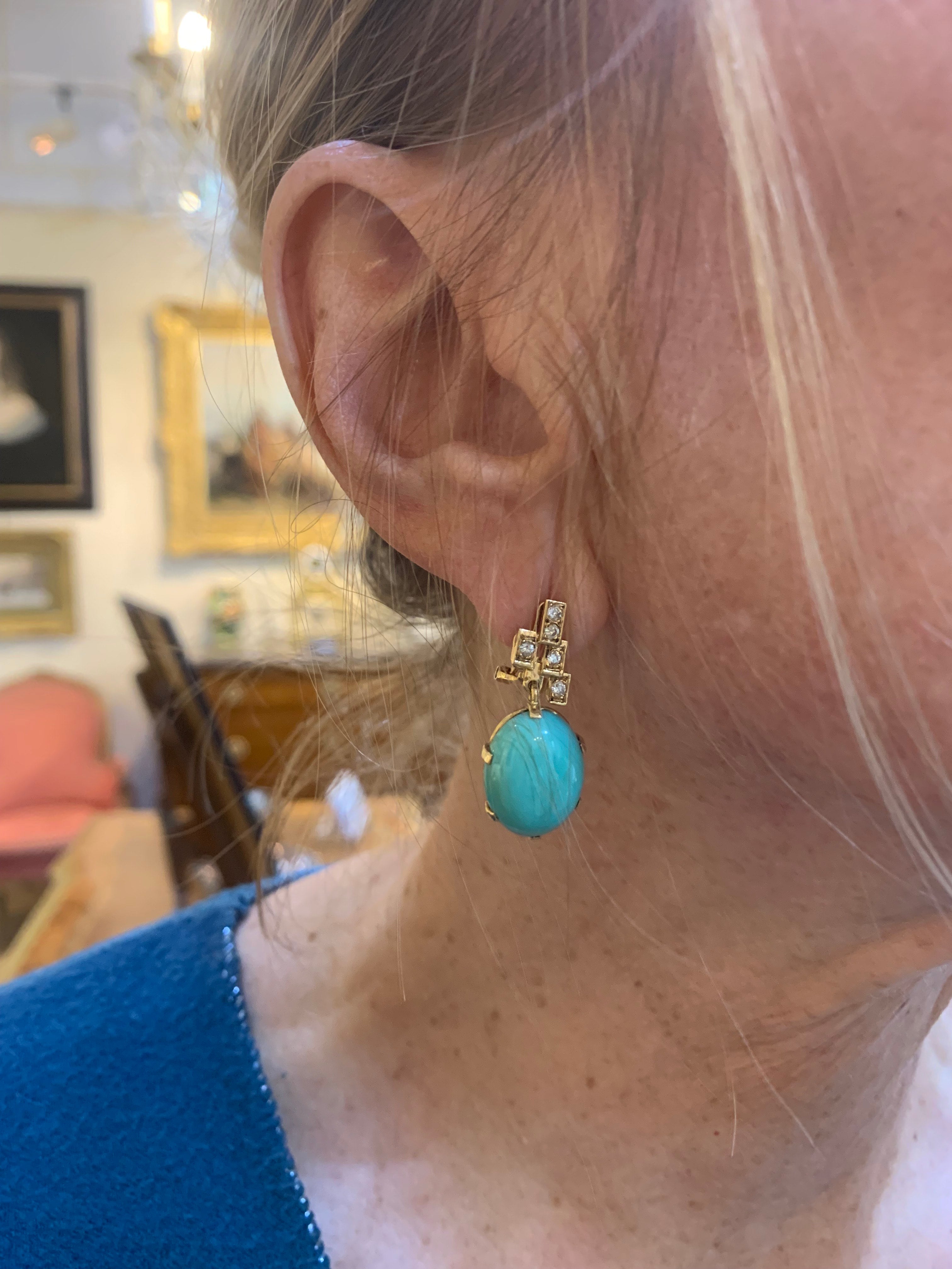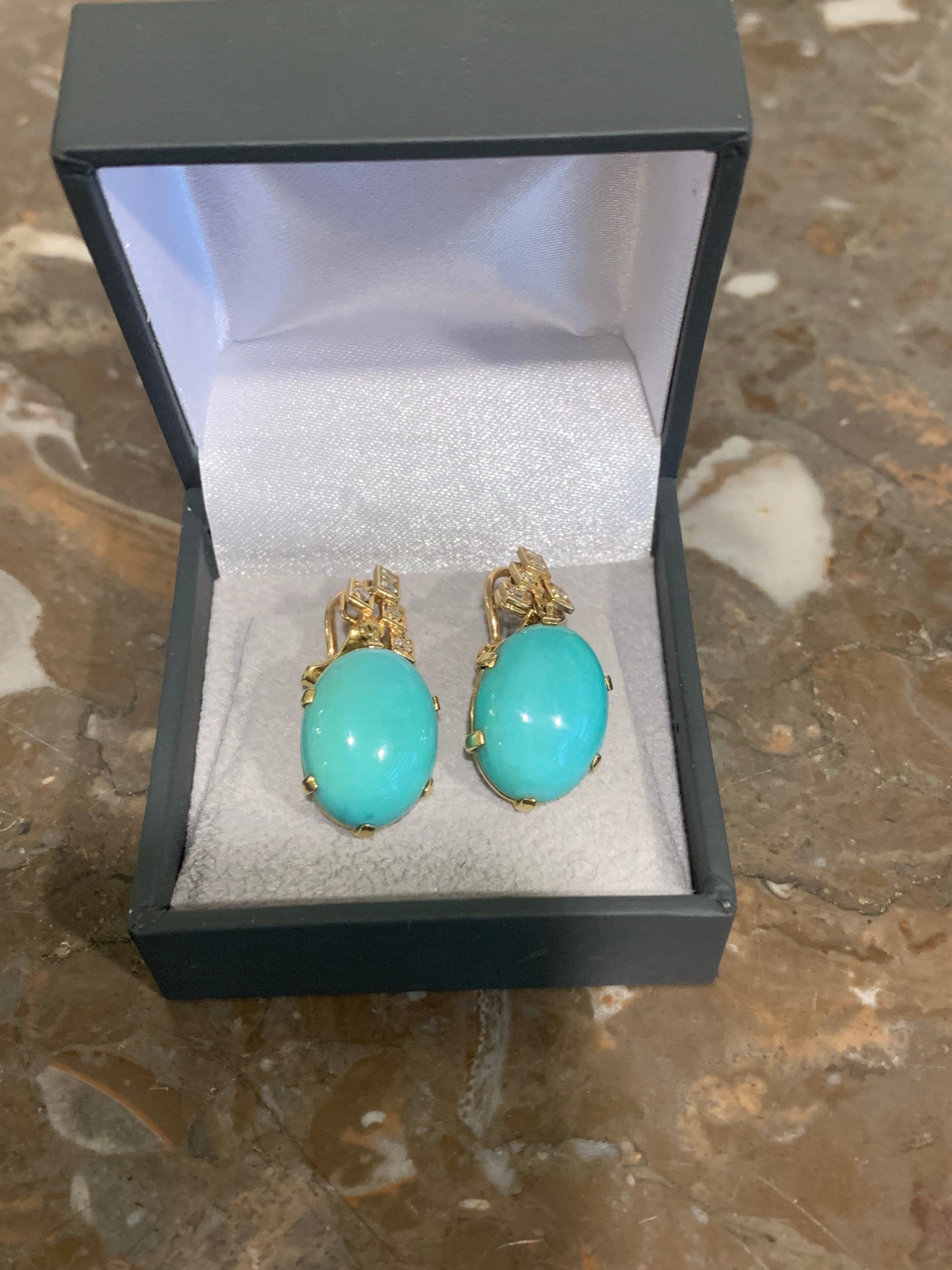 Pair of yellow gold earrings set with turquoise cabochons and brilliant-cut diamonds.