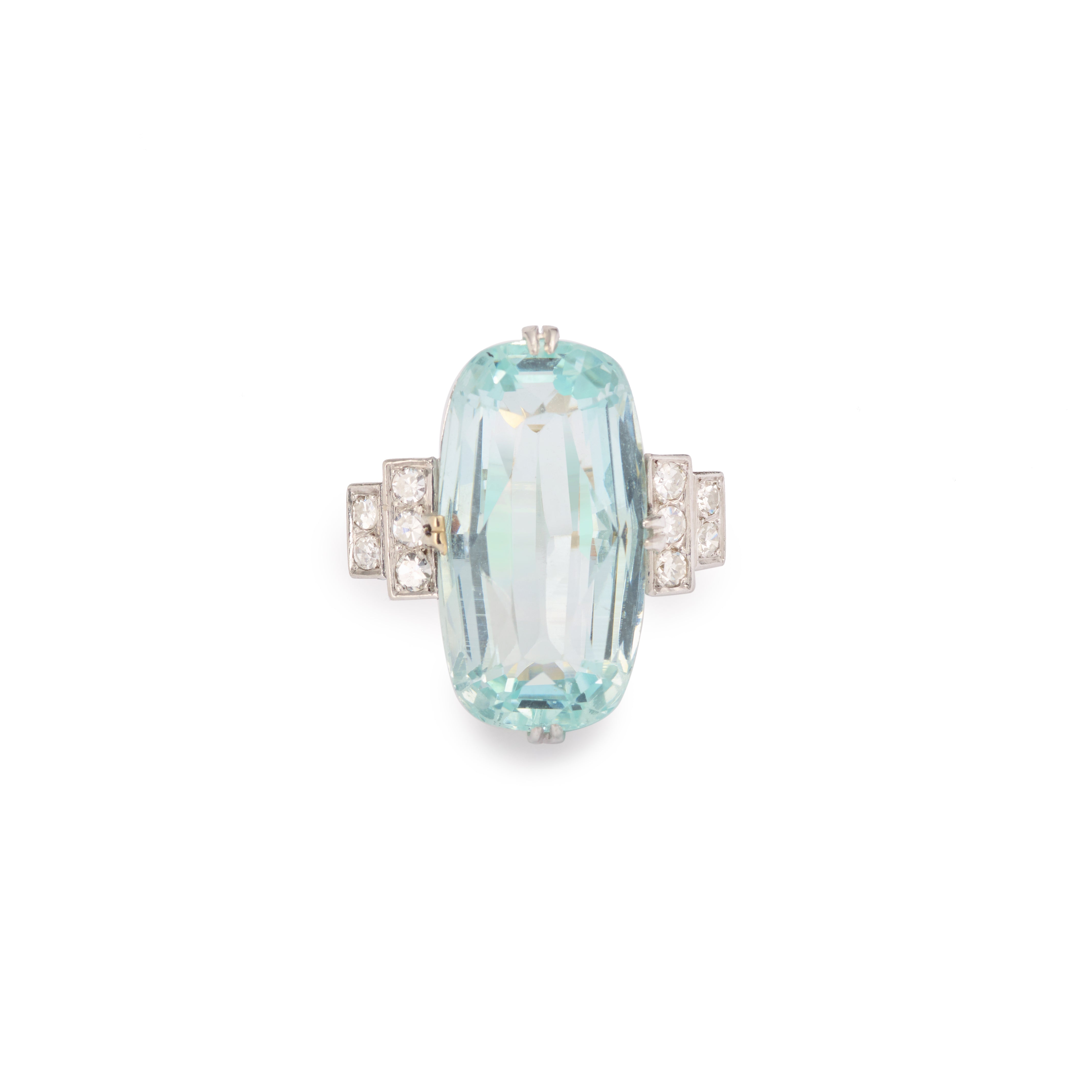 Bague art-déco centrée d’une aigue-marine ovale de 12 carats épaulée de diamants demi-taille.