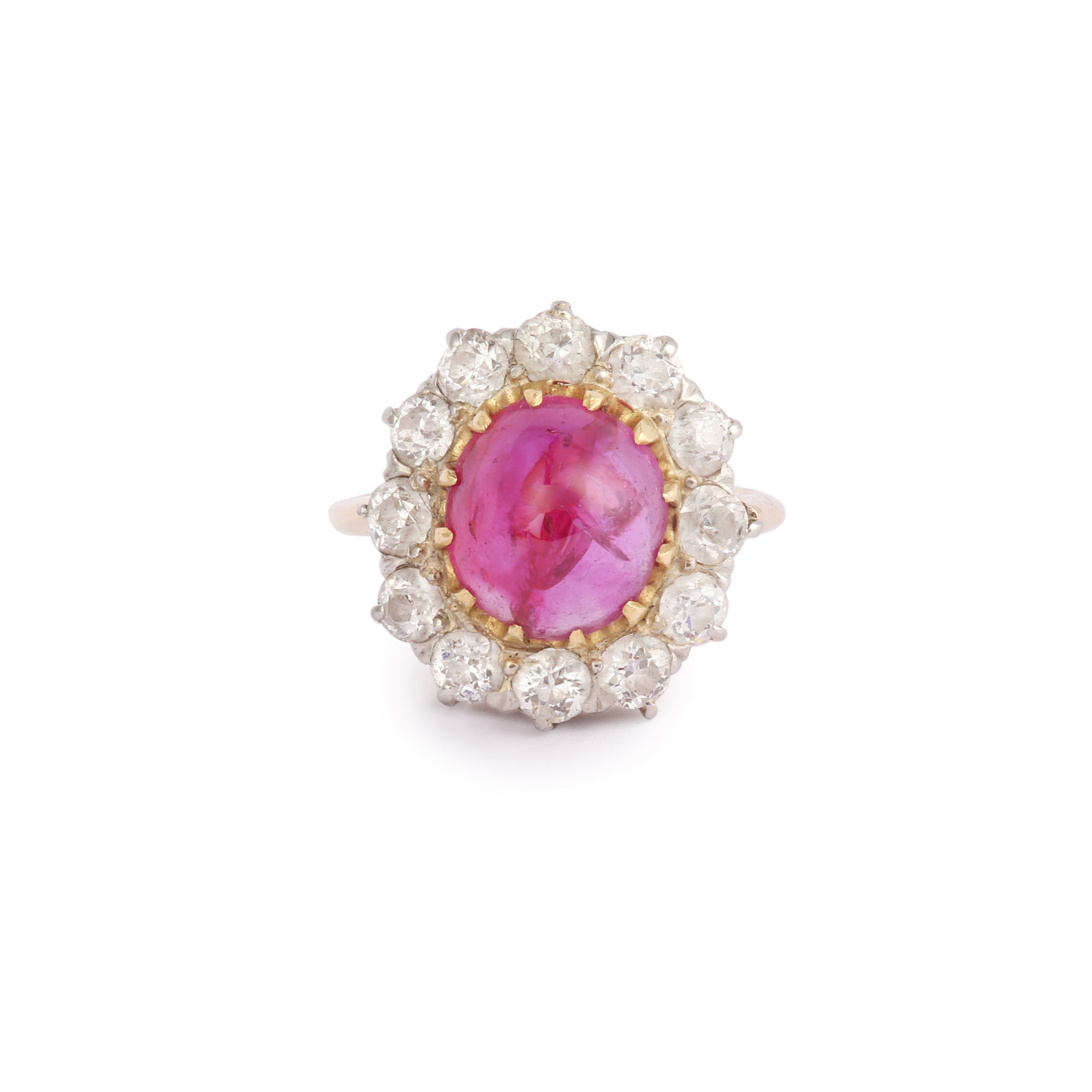 Bague pompadour sertie d'un exceptionnel rubis birman cabochon non chauffé dans un entourage de diamants demi taille.
