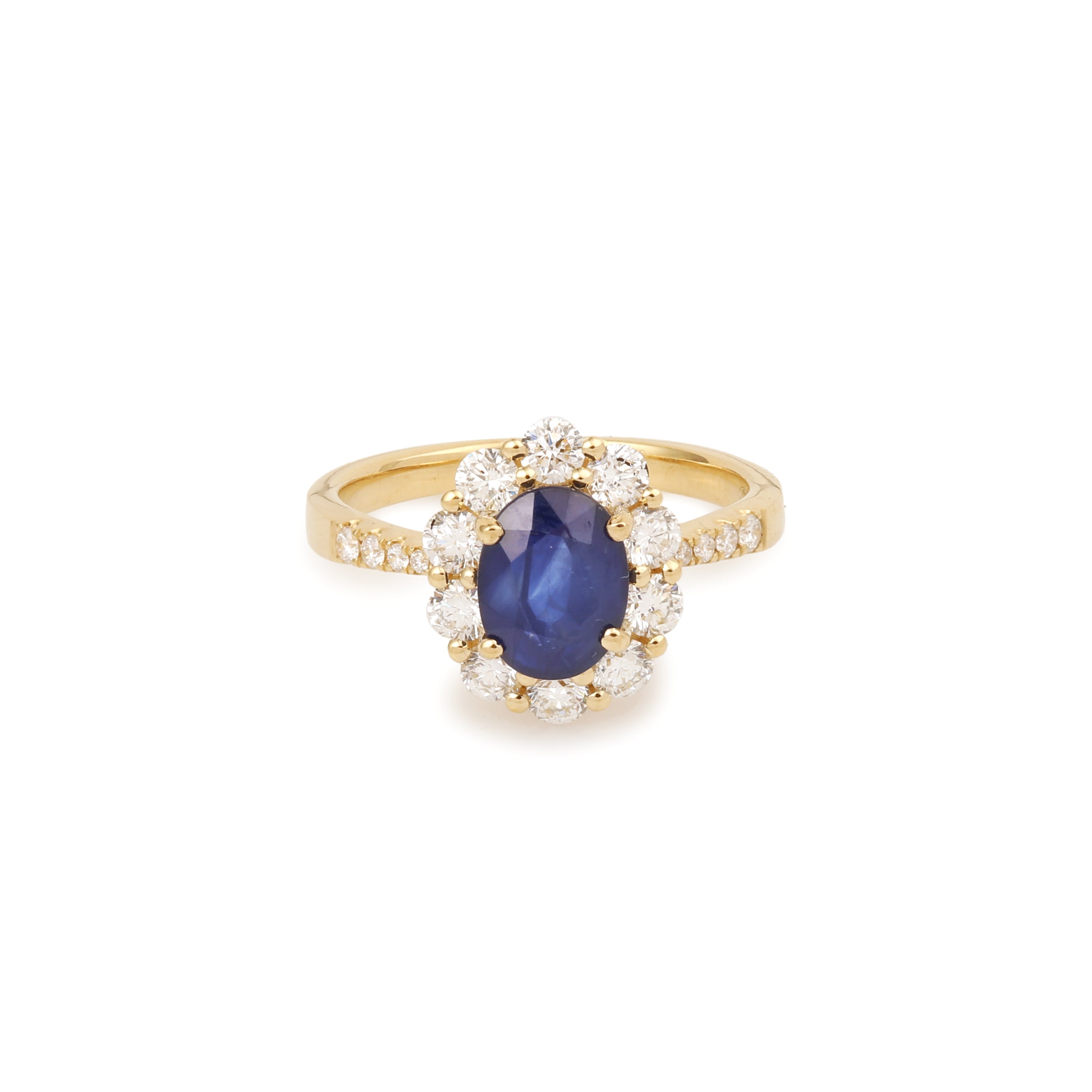 Magnifique bague pompadour en or jaune sertie d'un saphir ovale dans un entourage de diamants.