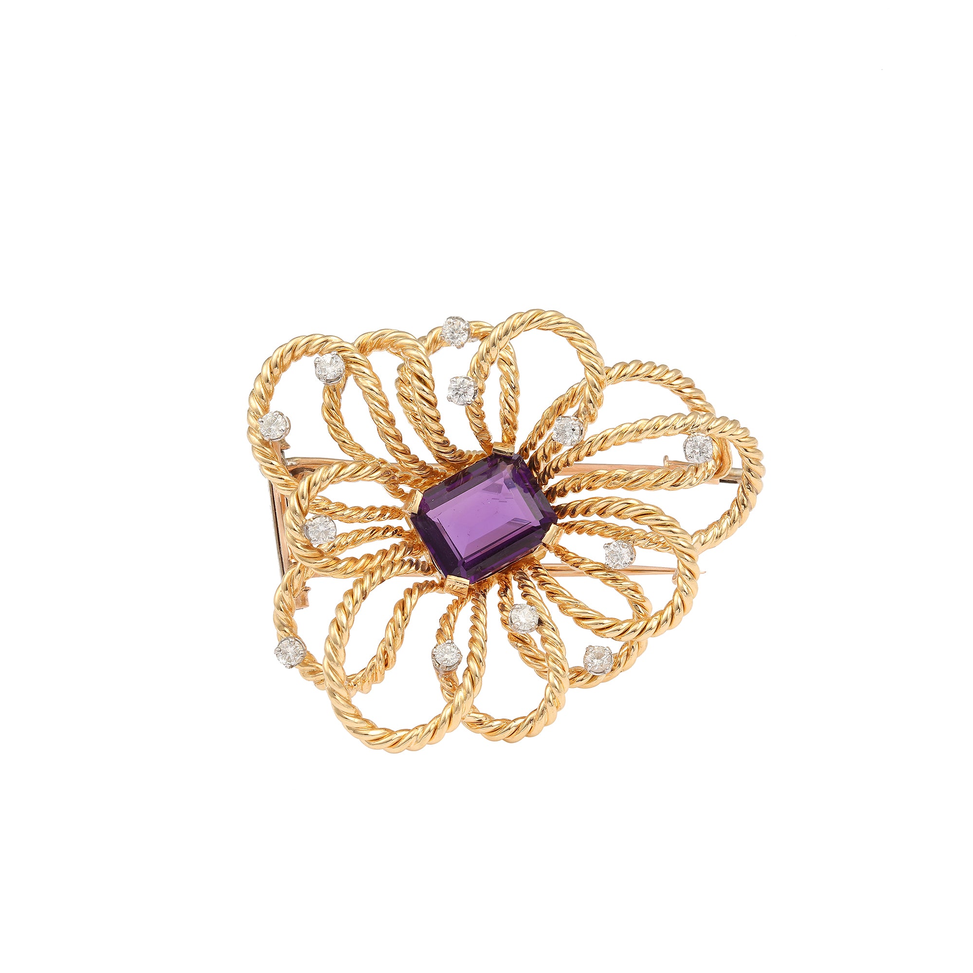 Magnifique broche fleur signée Boucheron sertie d'une améthyste centrale de taille émeraude et de 12 petits diamants ronds de taille brillants, montée sur or jaune torsadé.