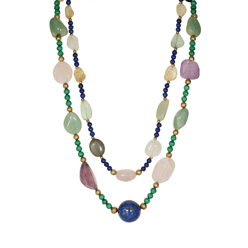 Superbe sautoir double rang composé de galets de quartz rose, cristal de roche, agate, calcédoine et aventurine intércalés de boules en lapiz-lazuli et en malachite etc….intercalé de boules de vermeil brossé.