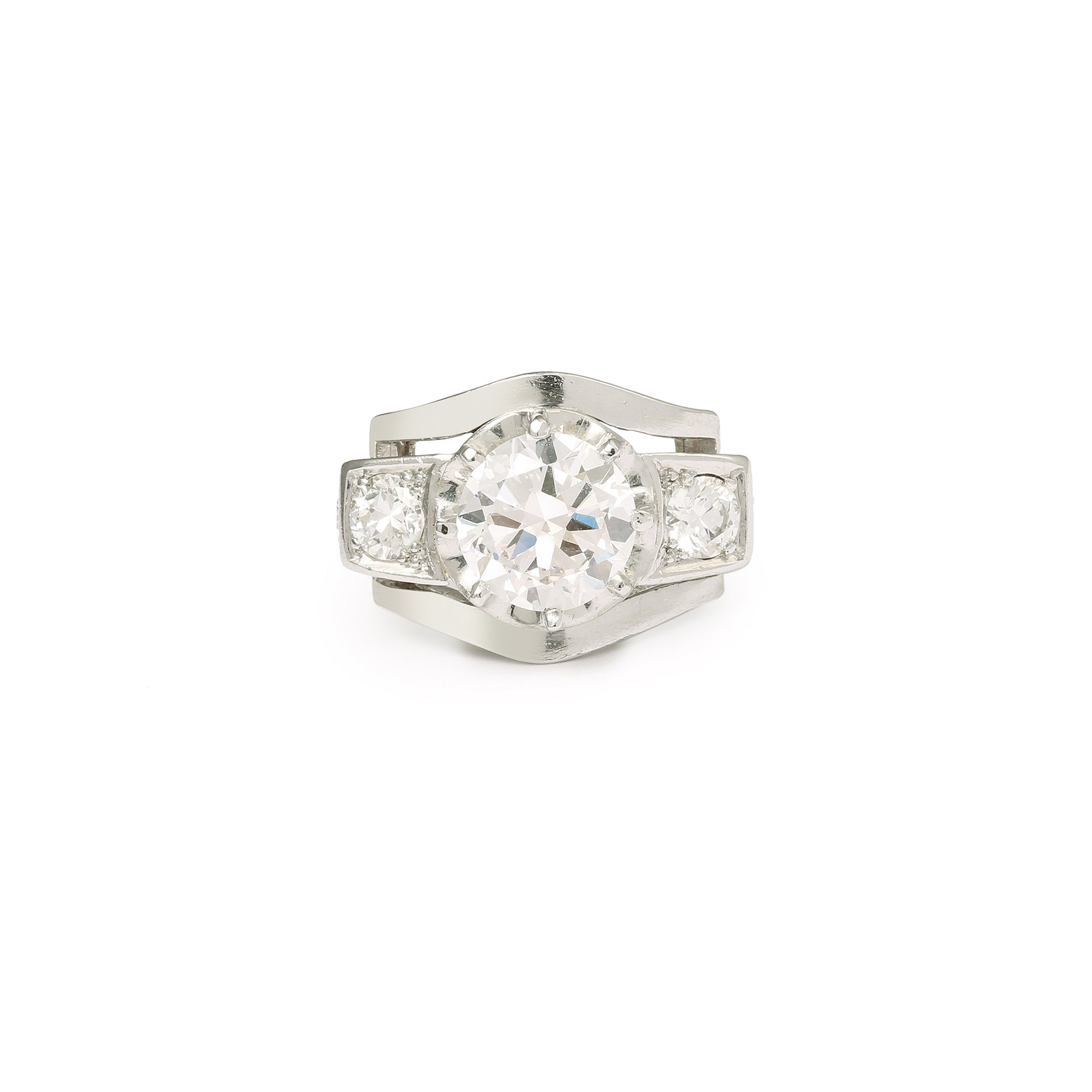 Magnifique bague art déco trilogie en or gris 18 carats sertie d’un diamant central demi-taille de 2.20 carats, de 2 diamants de 0.30 carats et de 4 autres petits diamants sur le corps de bague. France circa 1930/1940