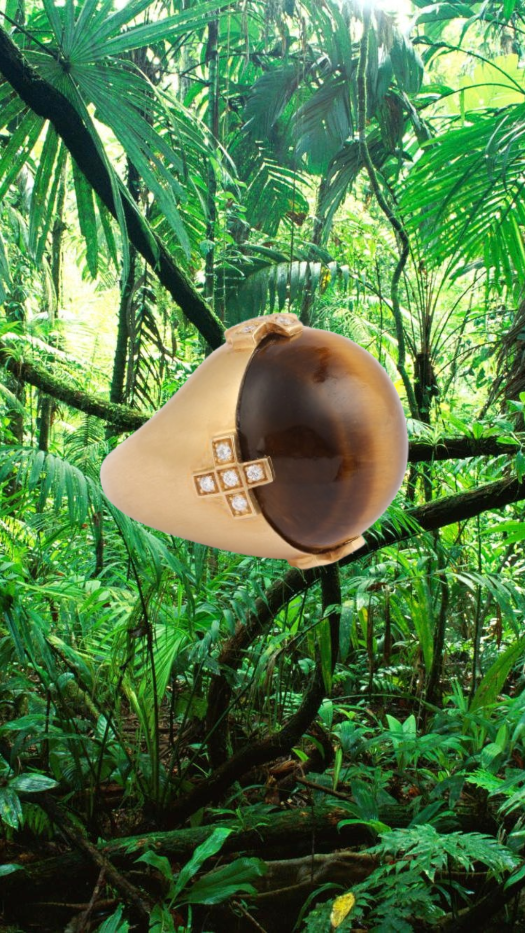 Imposante bague en or jaune brossé, présentant un important cabochon de quartz œil de tigre maintenu par des croix ornées chacune de cinq diamants taille brillant chacune.