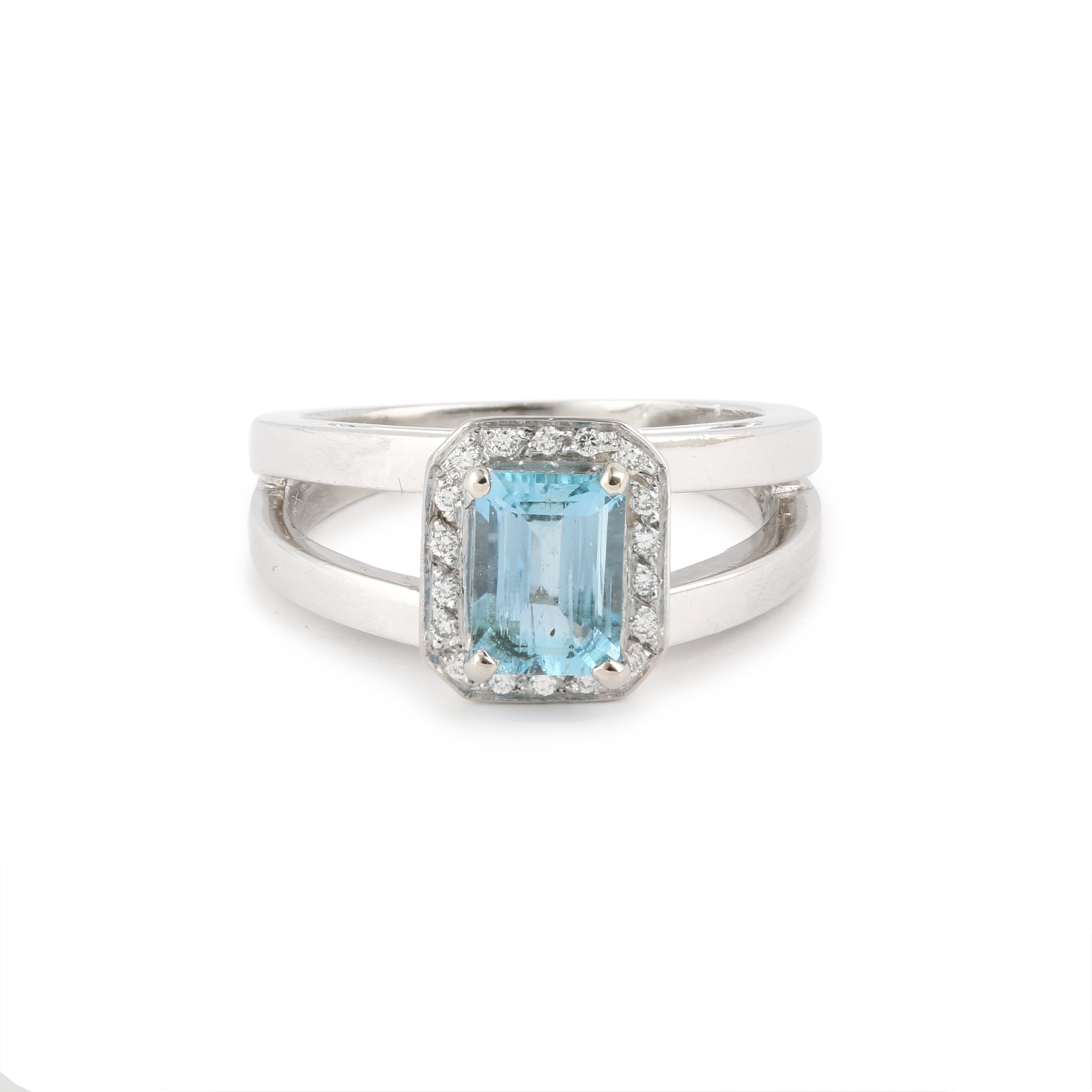 Bague en or gris centrée d'une aigue-marine rectangle dans un entourage de diamants, les épaules doublées.
