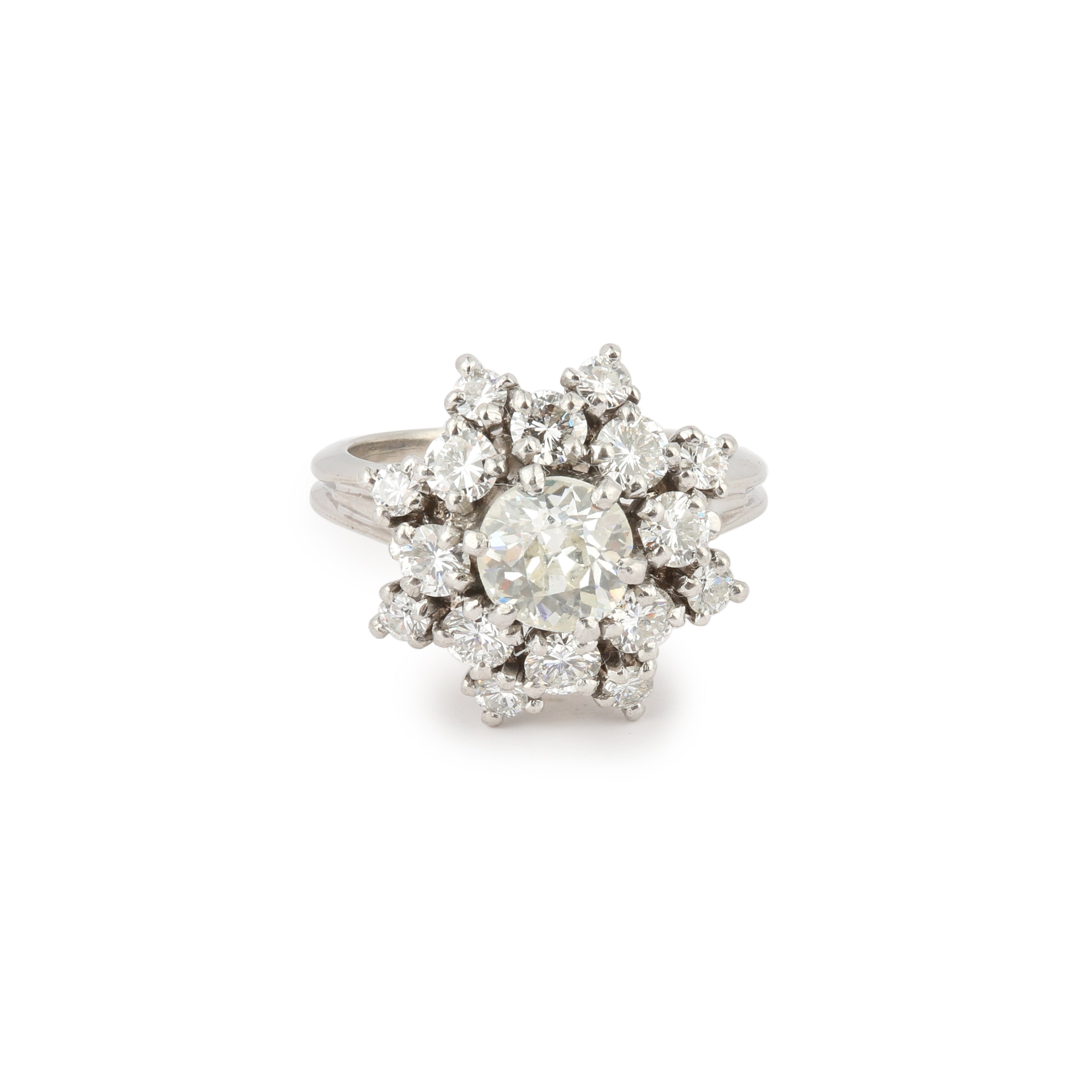 Magnifique bague marguerite en platine centrée d'un diamant taille ancienne dans un entourage de diamants taille moderne.