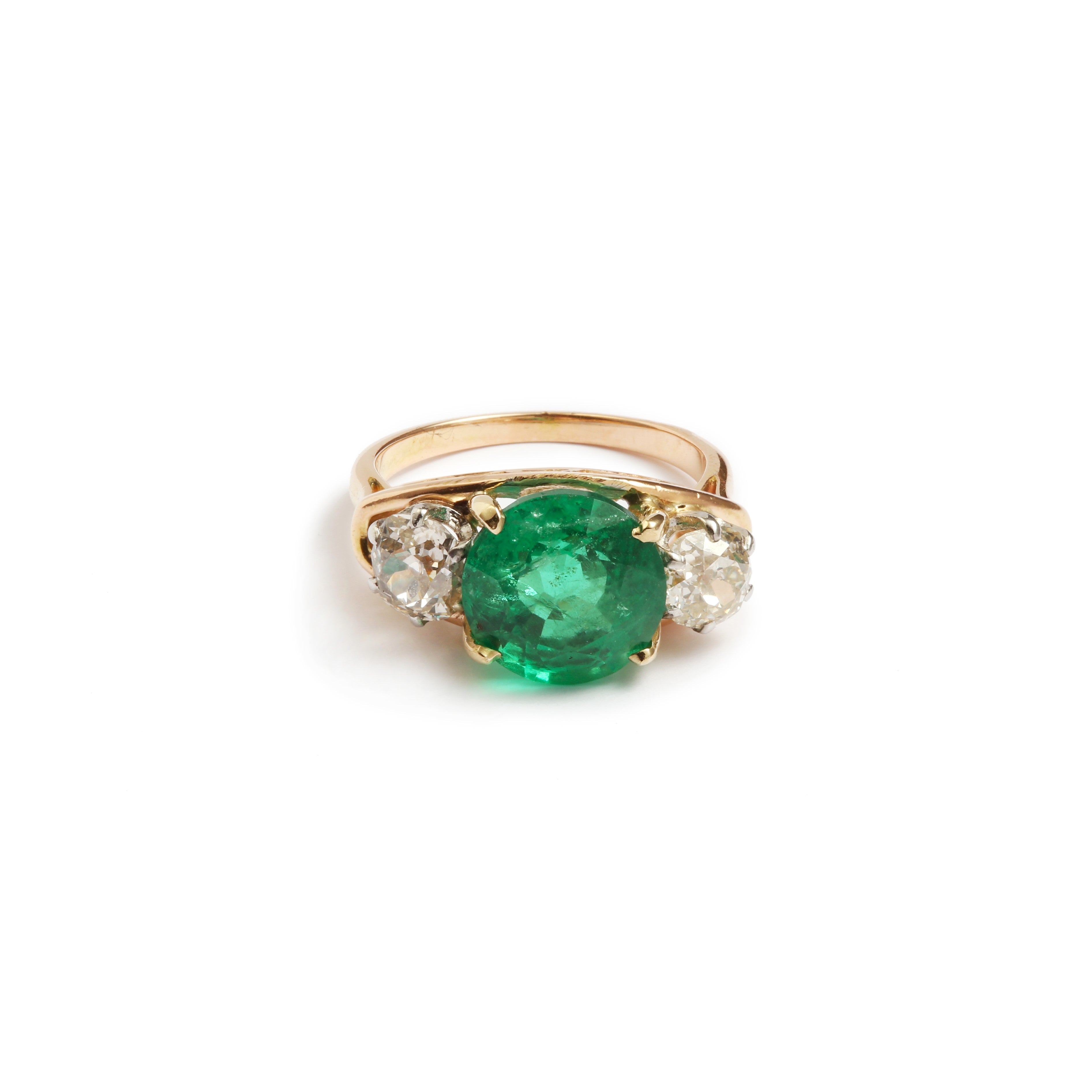 Bague sertie d'une émeraude éthiopienne taille ronde entourée de deux diamants taille ancienne coussin.