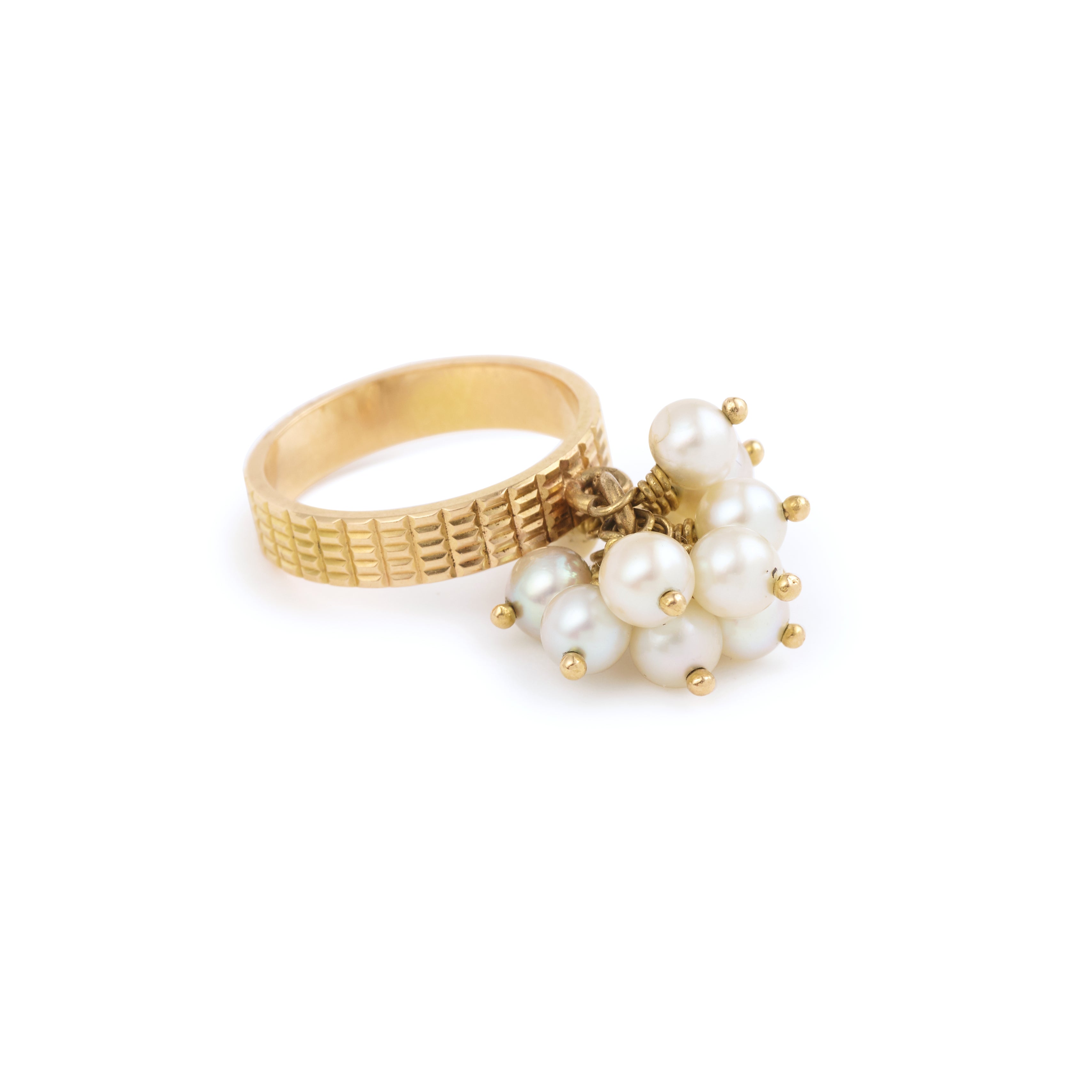 Bague en or jaune ornée de 12 petits grelots de perles de culture. Chaque grelot articulé bouge sur le doigt.