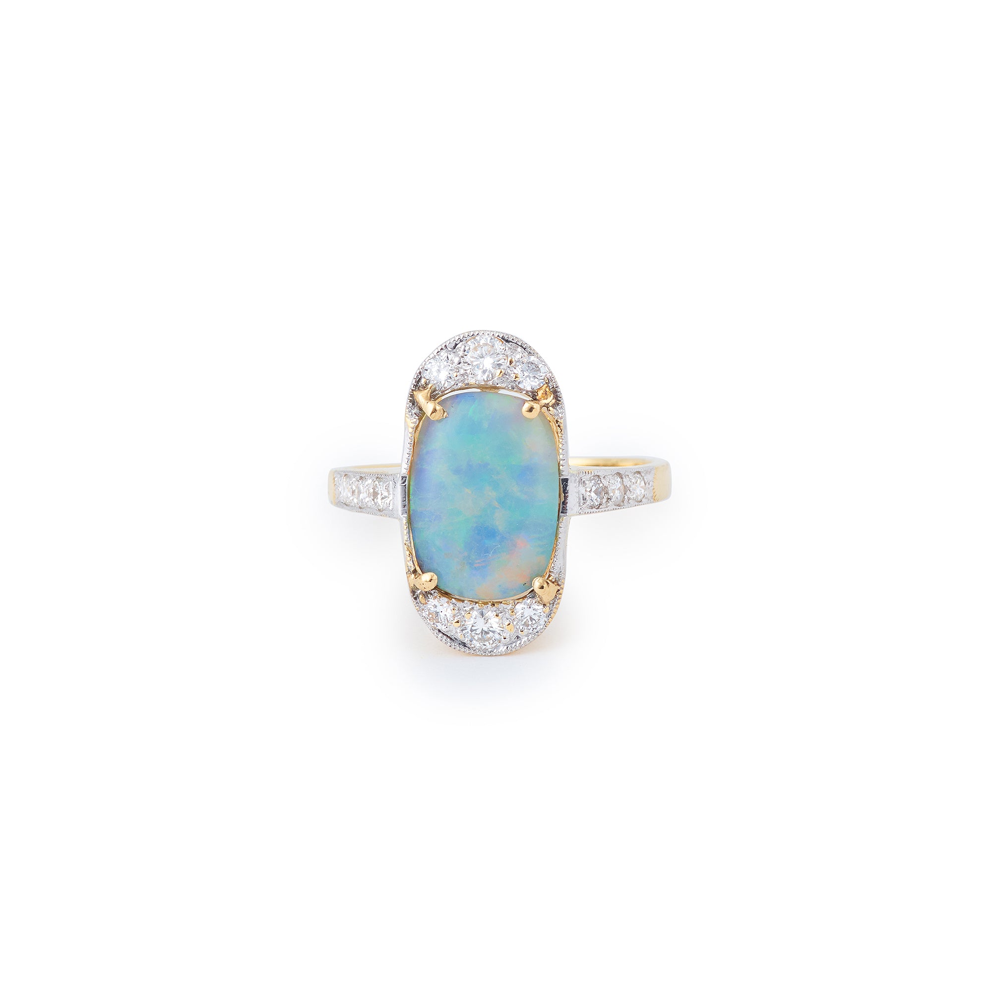 Ravissante bague en or jaune sertie de diamants et d’un cabochon d’opale aux jeux de couleurs bleutés