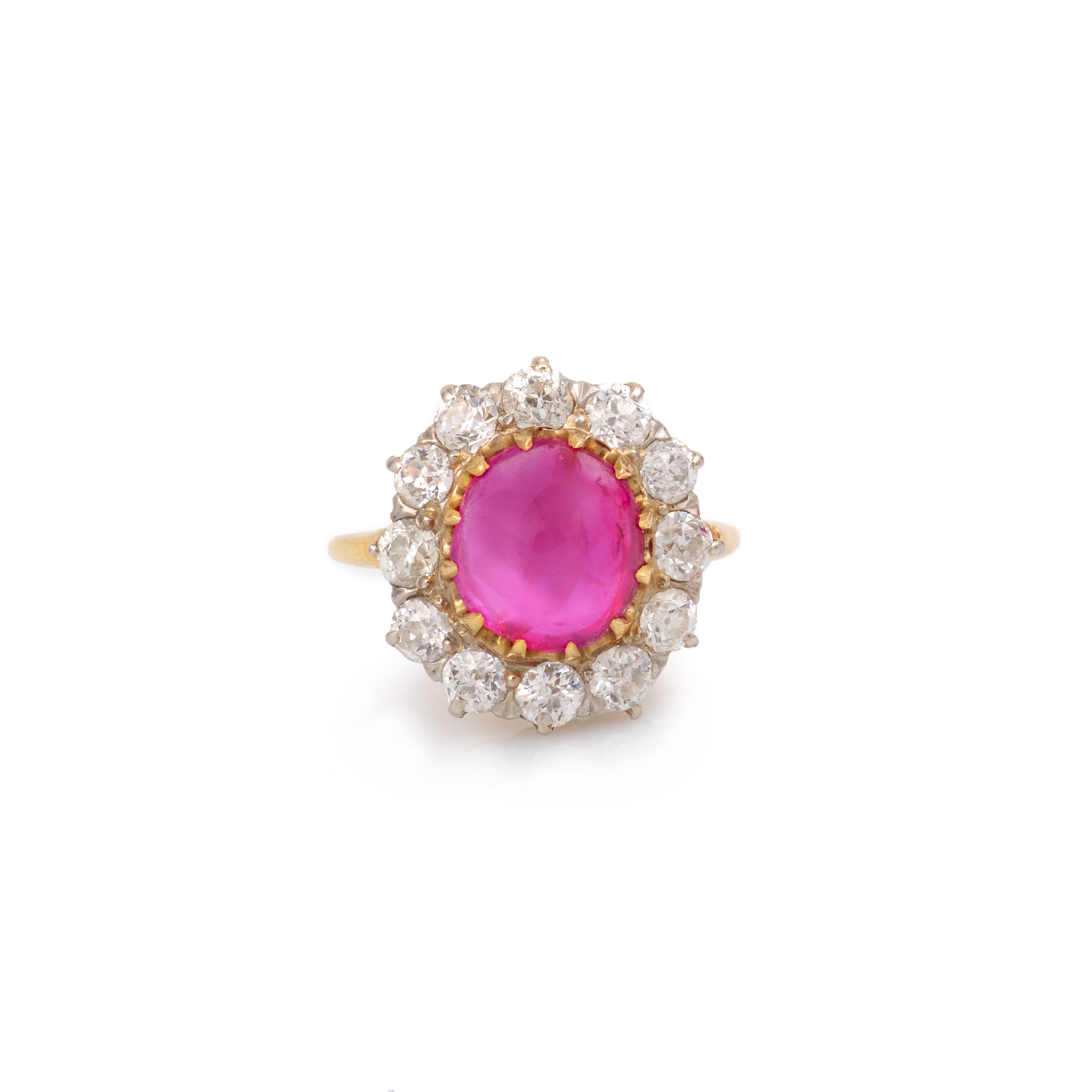 Bague pompadour sertie d'un exceptionnel rubis birman cabochon non chauffé dans un entourage de diamants demi taille.