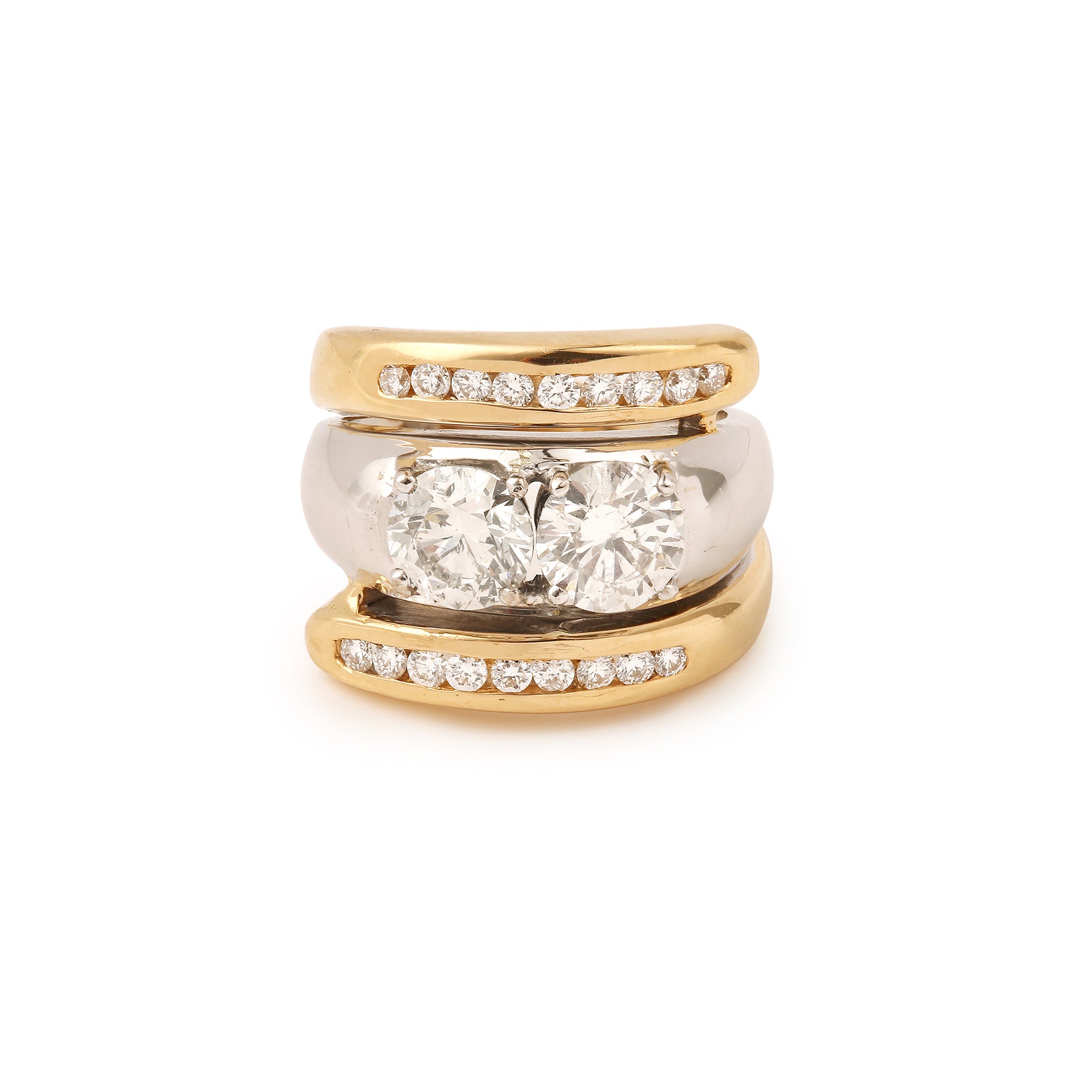 Bague 2 ors sertie de 2 diamants naturels taille brillant de 1 carat chacun, les cotés pavés de lignes de diamants.