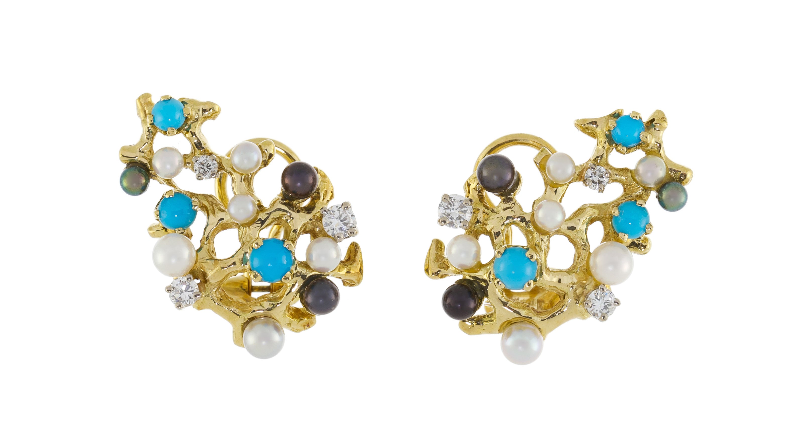 Exceptionnelle paire de clips d'oreilles signée Gilbert Albert en or jaune sertie de turquoises, de diamants et de perles.