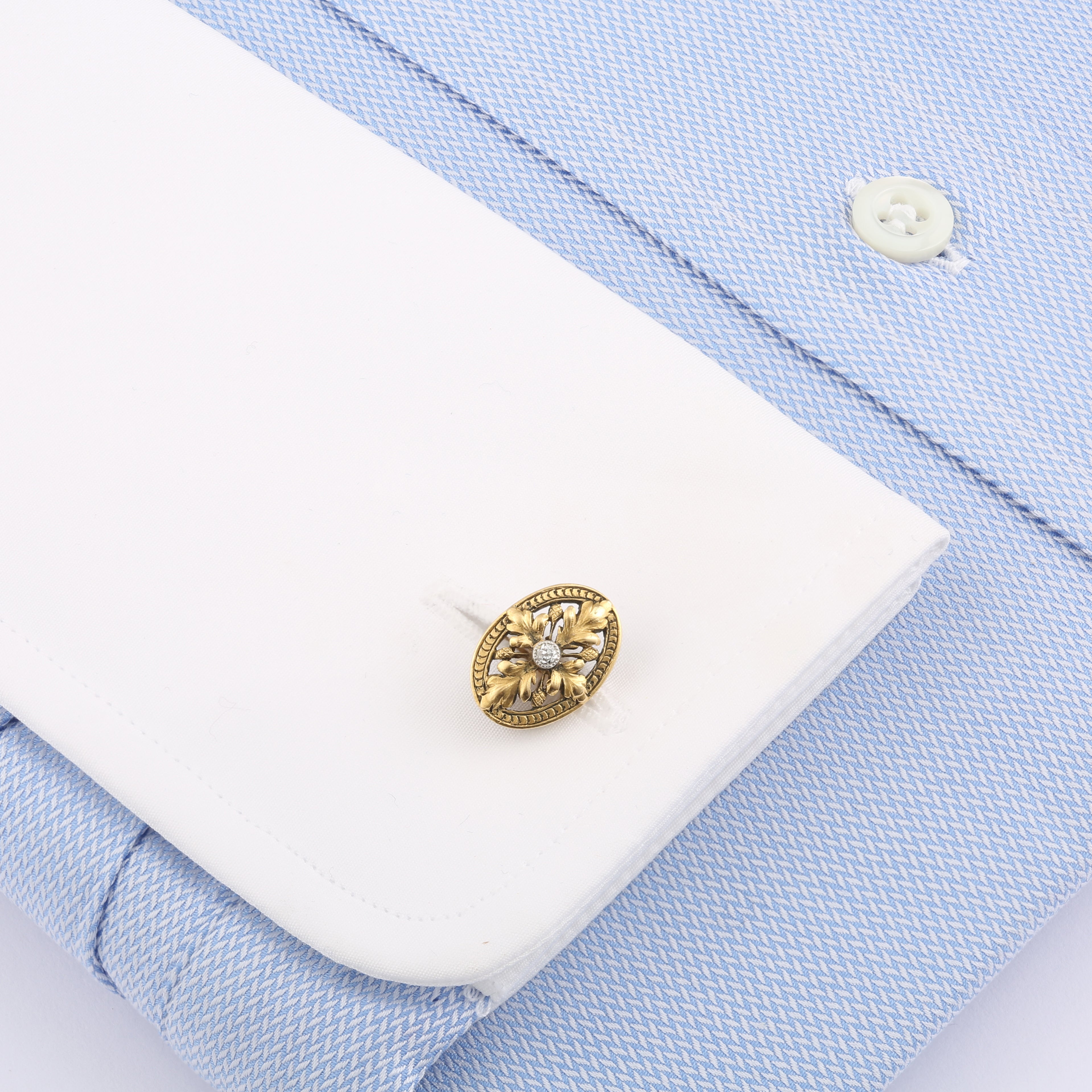 Paire de boutons de manchettes anciens en or jaune figurant des feuilles de chêne et des glands centrés de diamants taille ancienne.