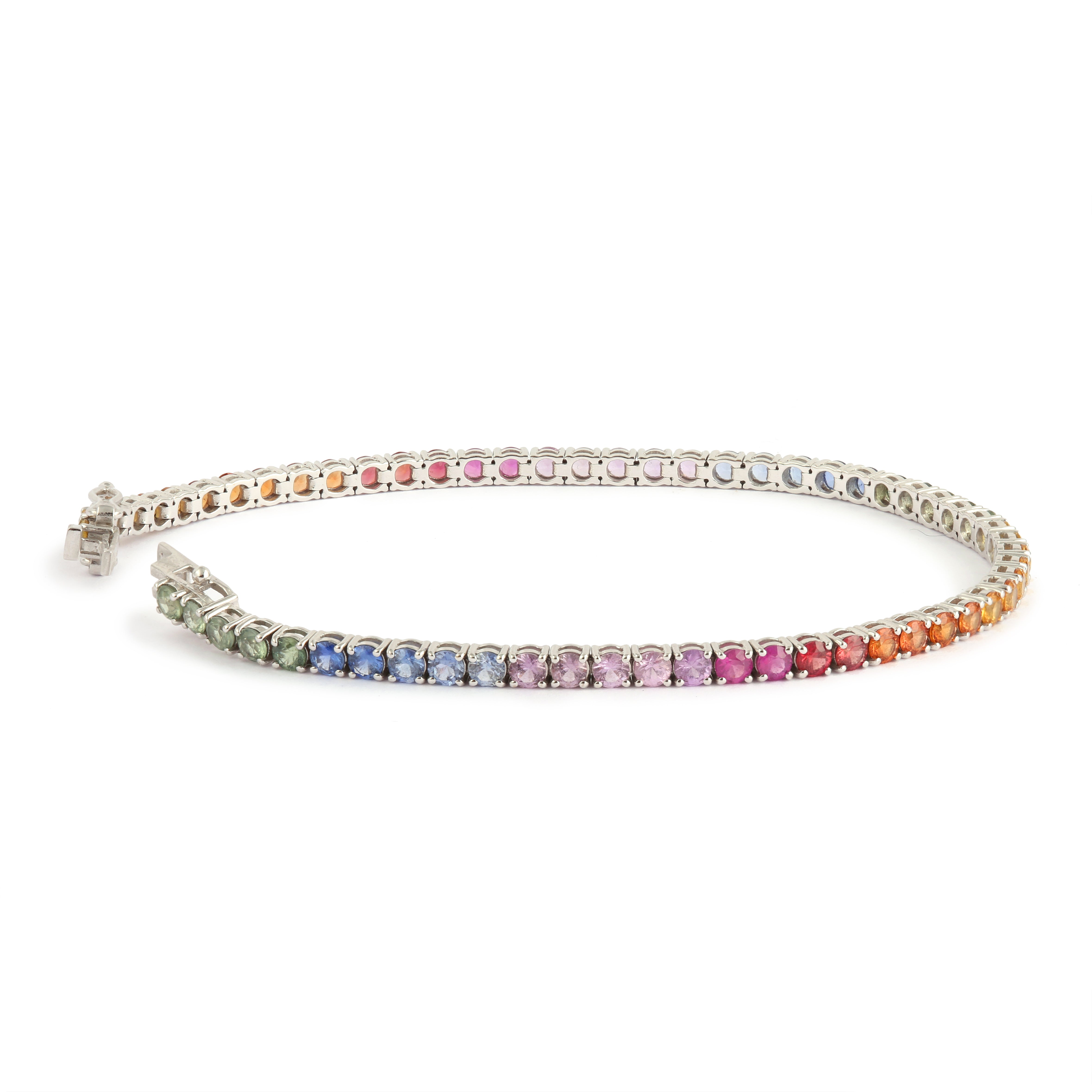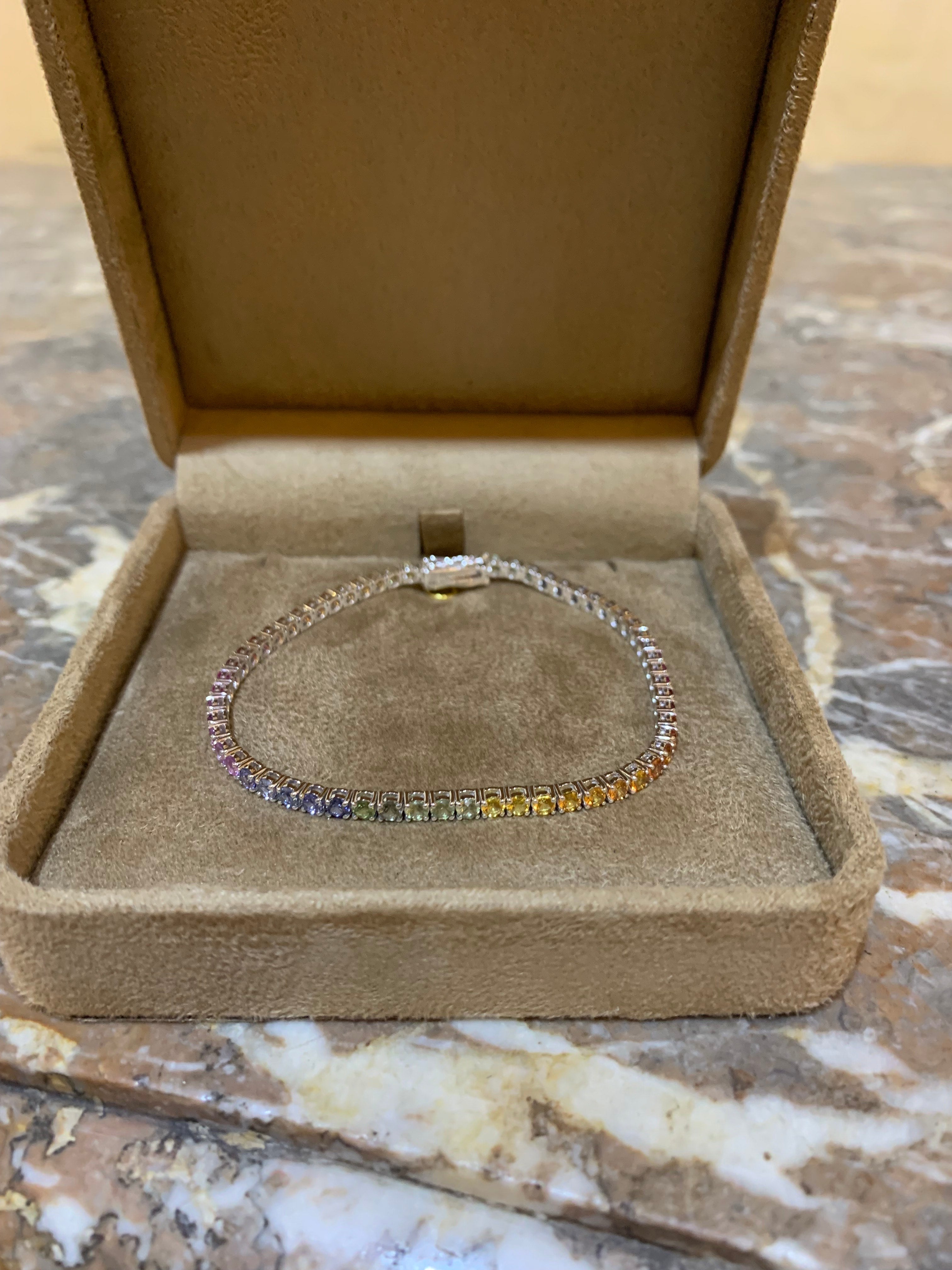 Très beau bracelet tennis en or gris serti d'une ligne de saphirs de couleurs en dégradé arc-en-ciel.