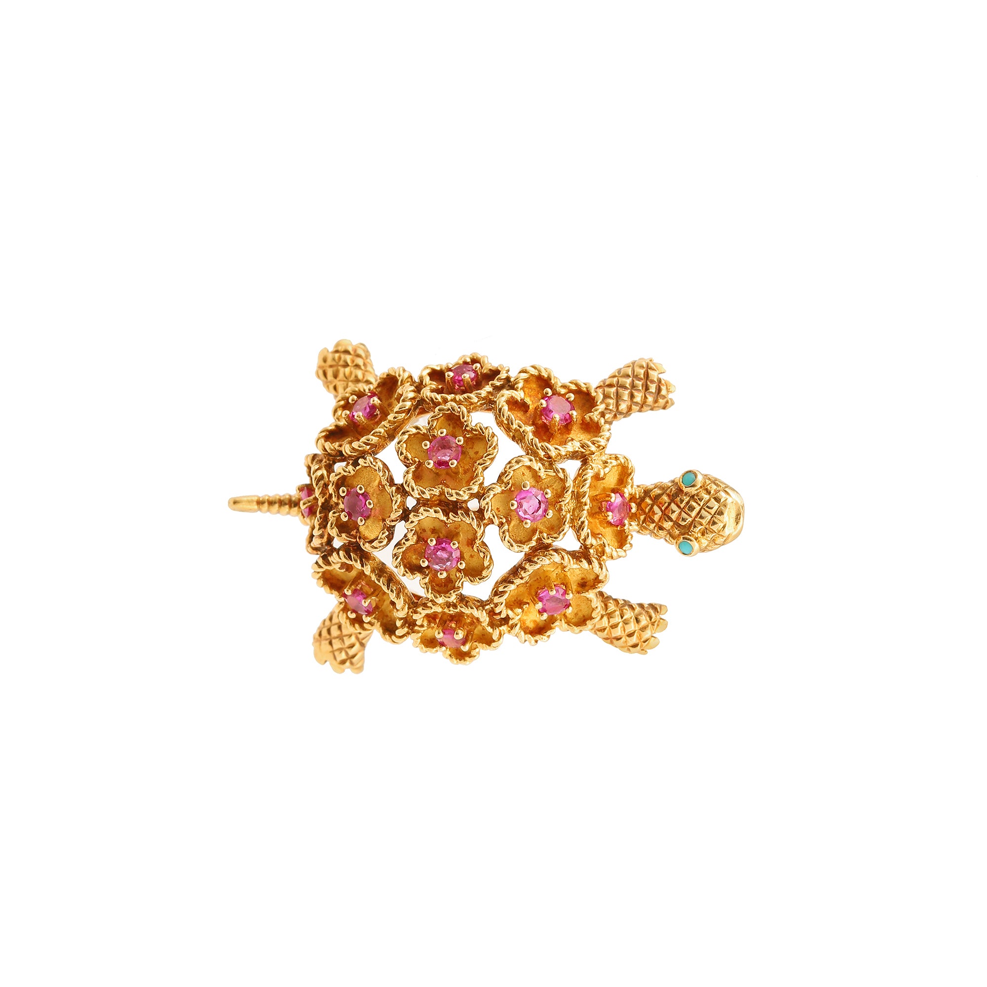 Broche tortue en or jaune sertie de rubis avec un poinçon de maitre de l'atelier Pons.