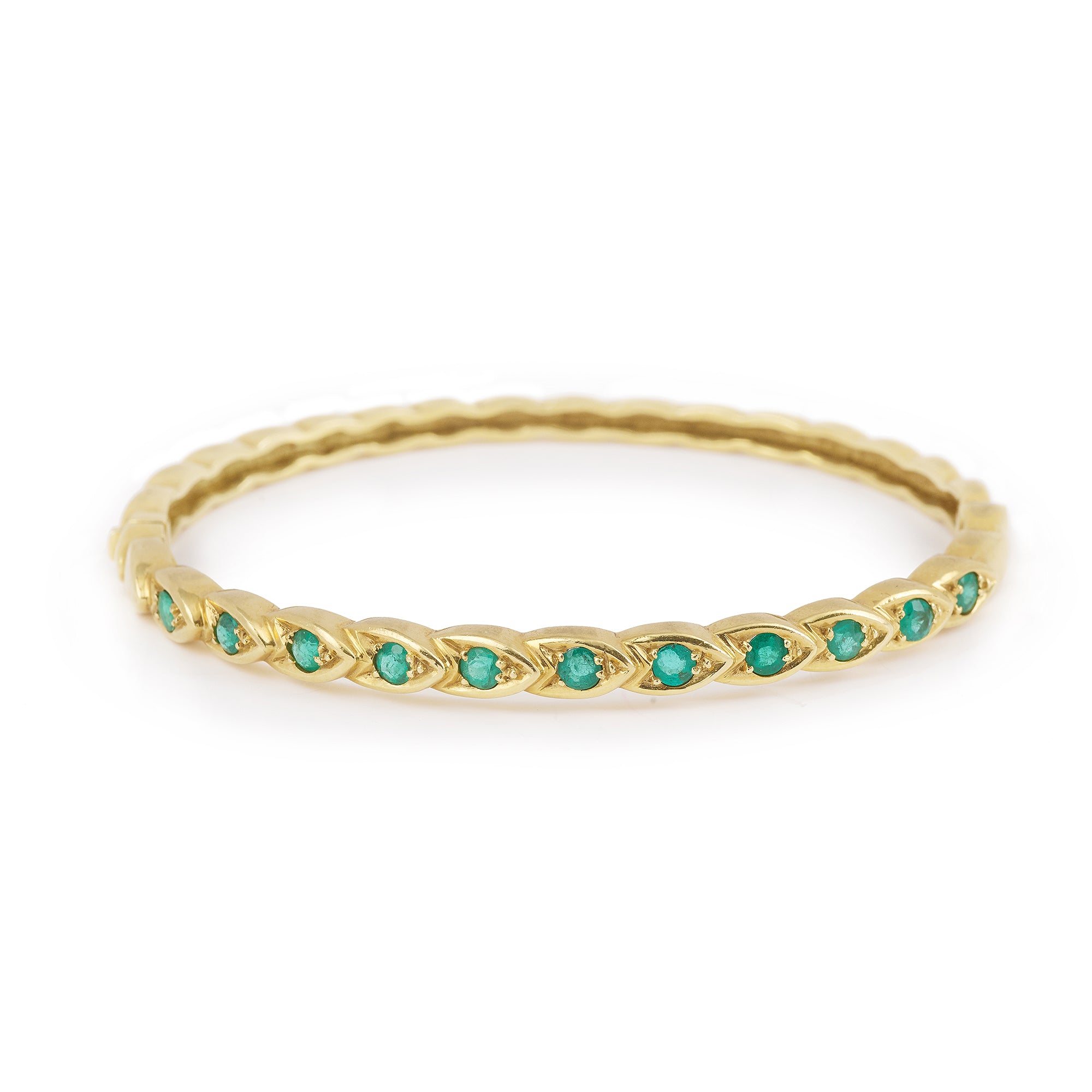 Délicat bracelet de la Maison Chaumet en or jaune 18 carats et serti de 11 émeraudes. Le bracelet est signé au niveau du fermoir.
