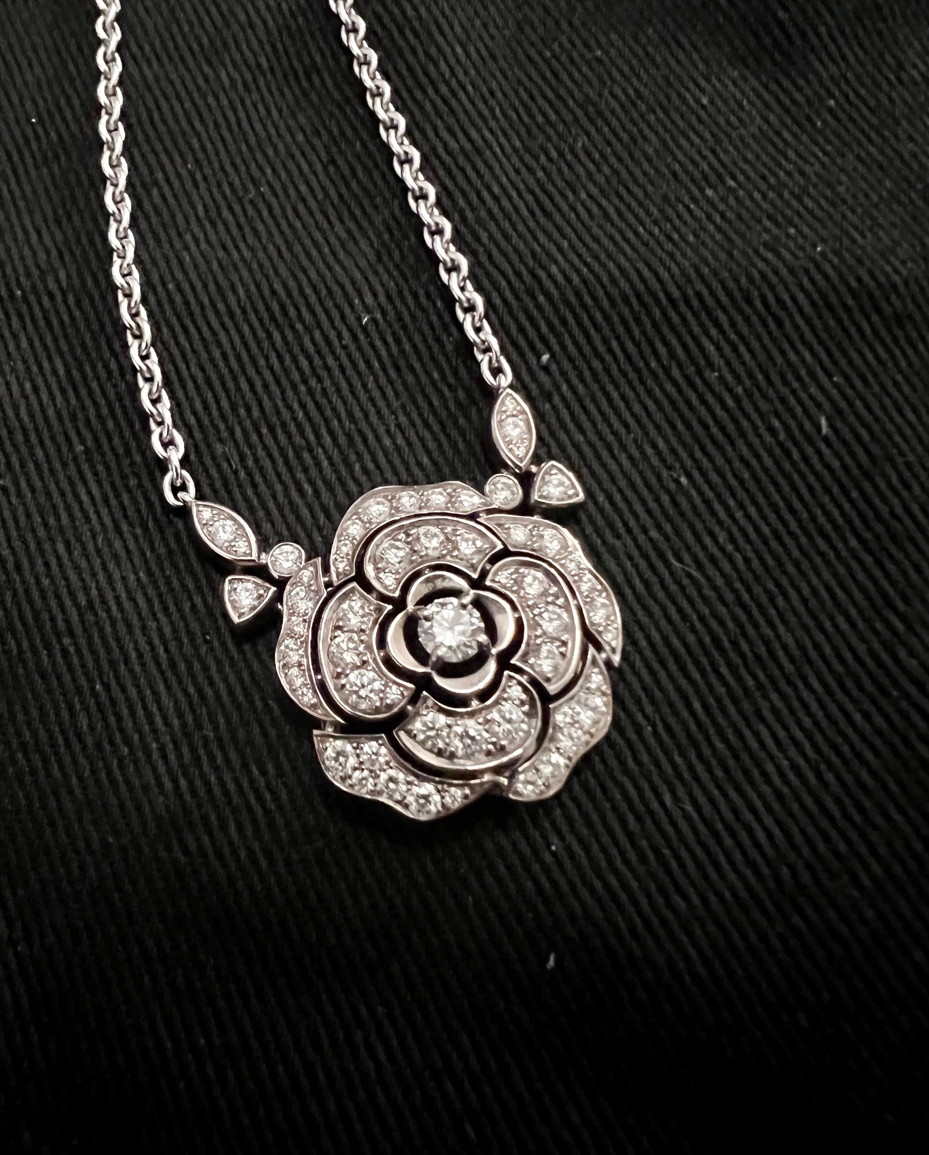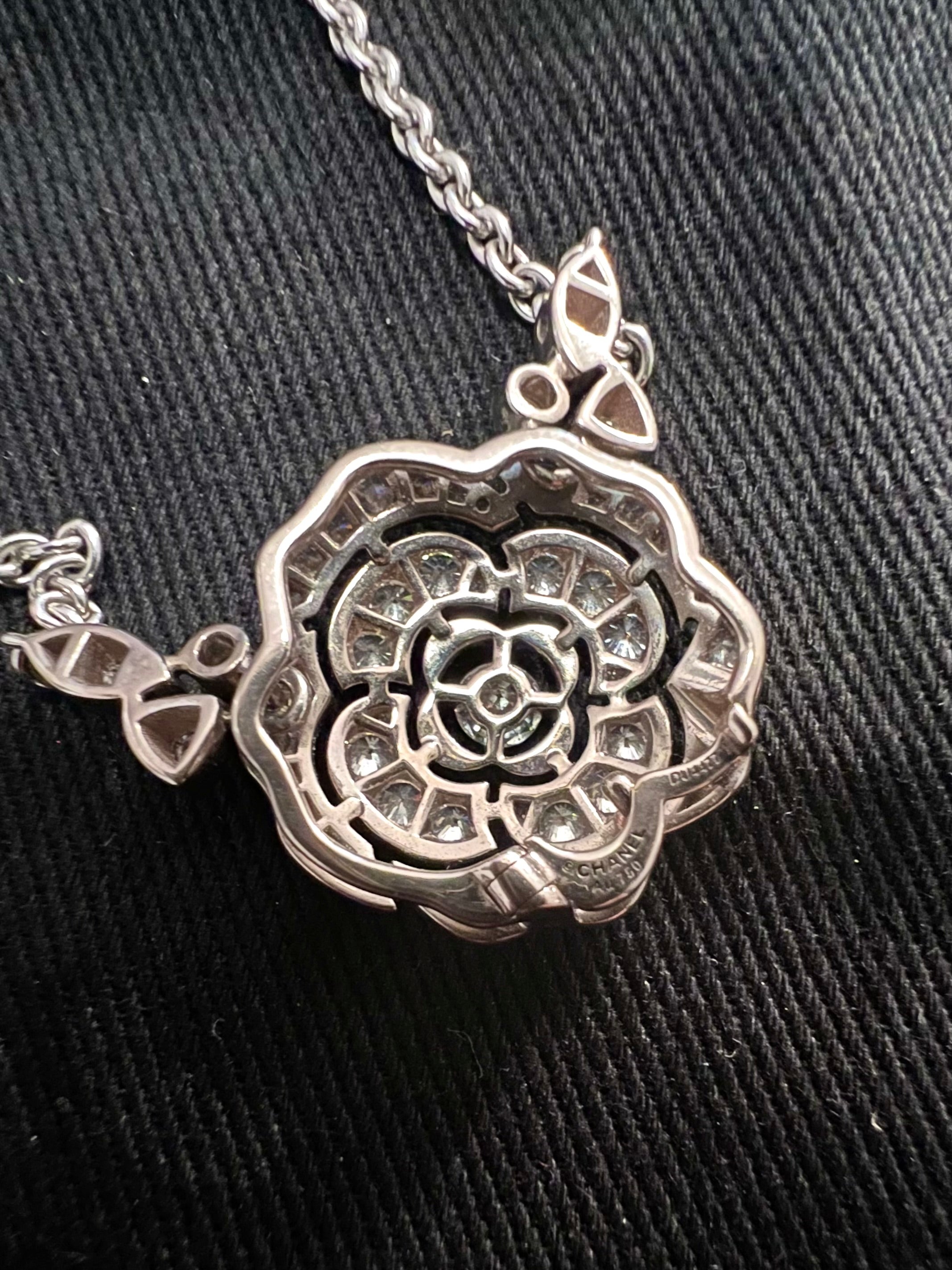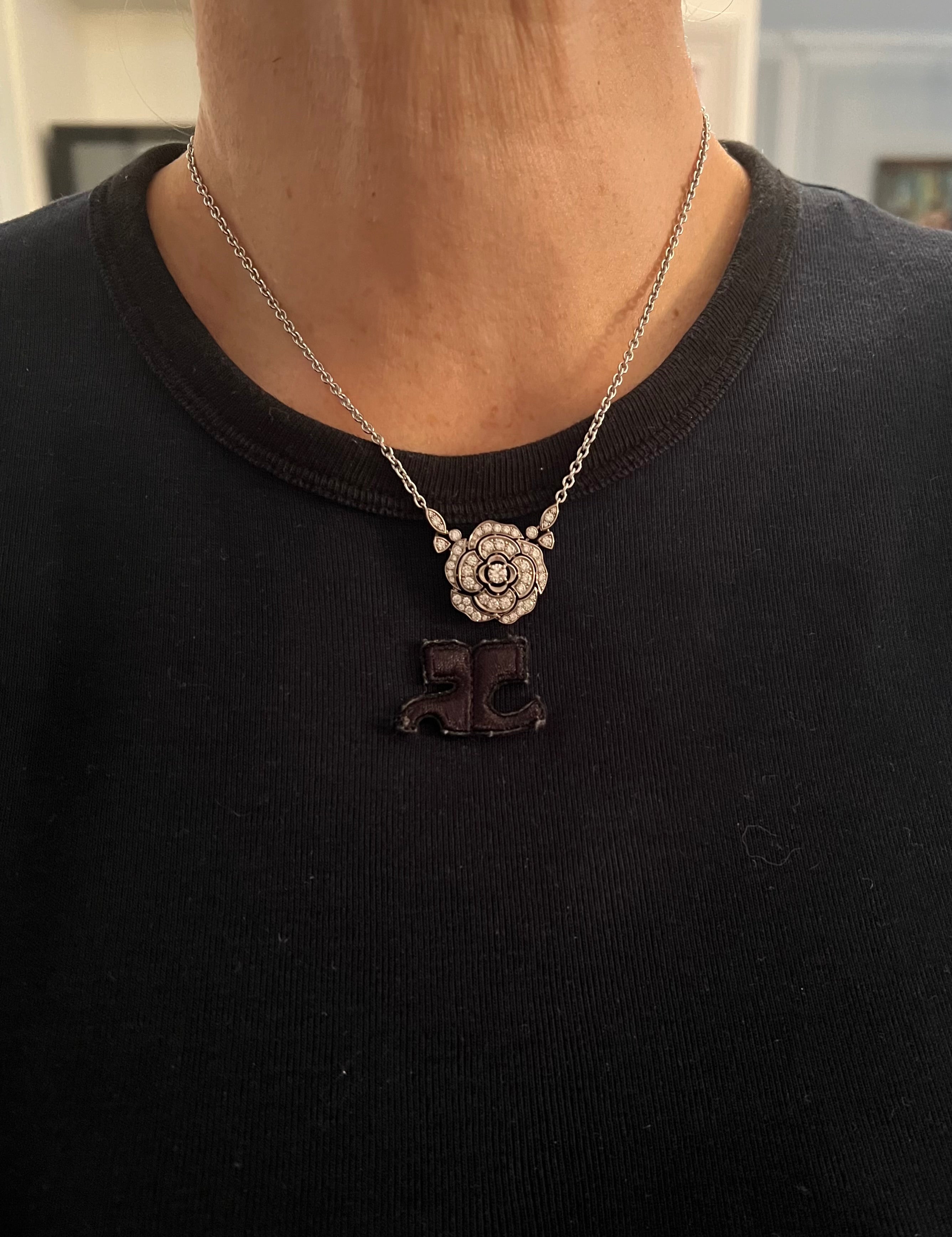 Elégant collier en or gris pavé de diamants signé Chanel, collection "Bouton de Camélia".