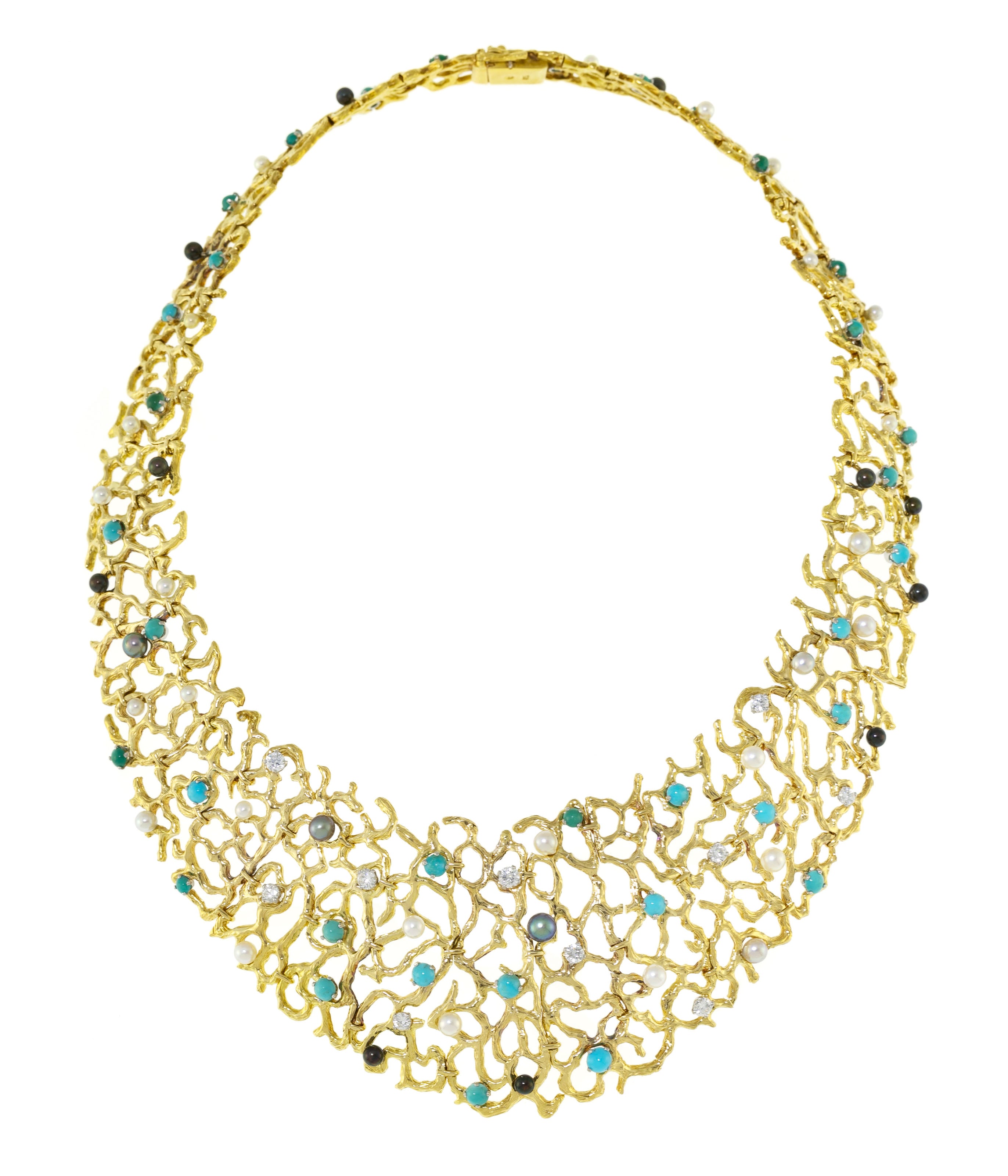 Exceptionnel collier plastron articulé Gilbert Albert en or jaune serti de turquoises, de diamants et de perles.