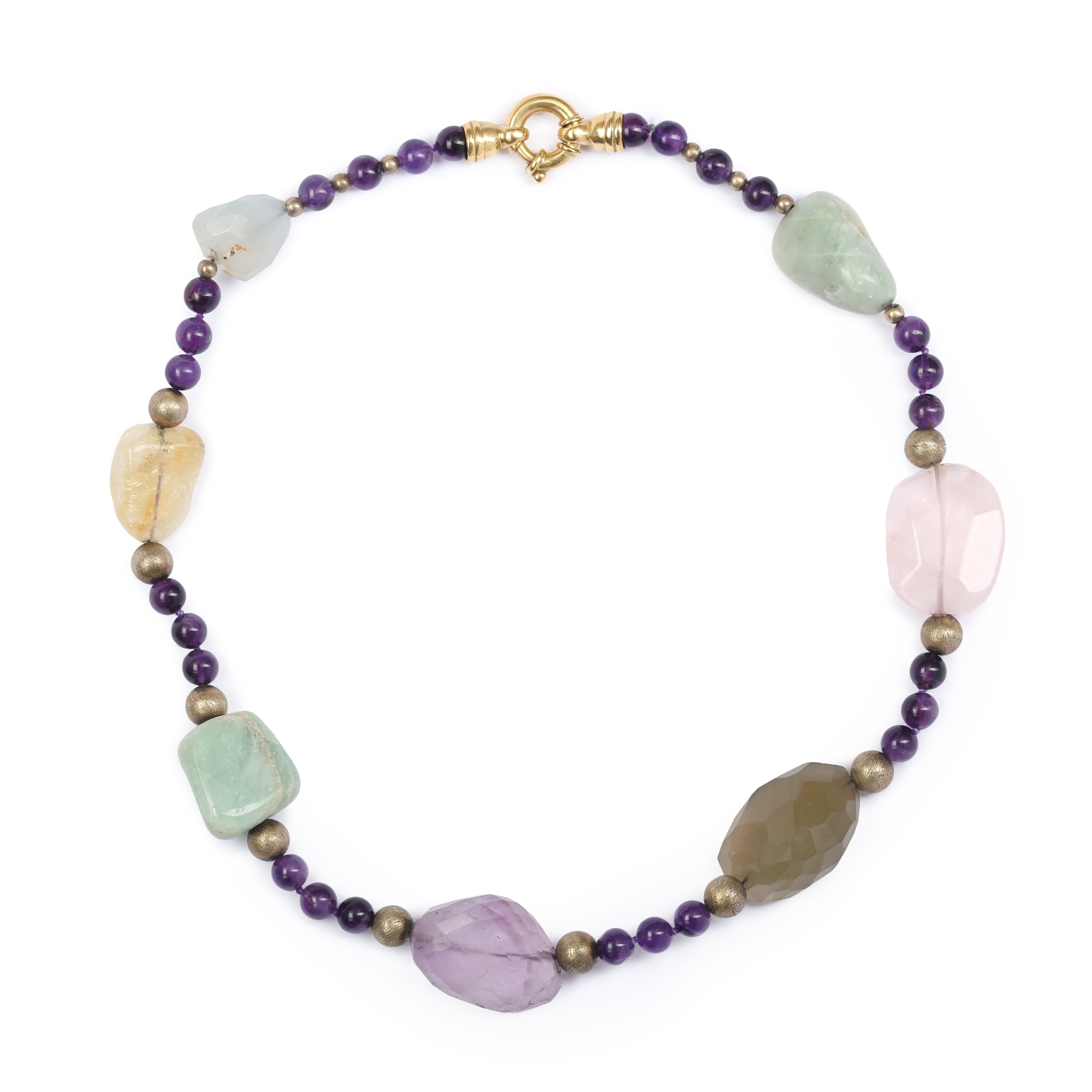 Collier composé de galets de quartz rose, cristal de roche, calcédoine et aventurine intercalés de boules d’améthystes, de boules de vermeil brossé et terminé par un fermoir plaqué or.