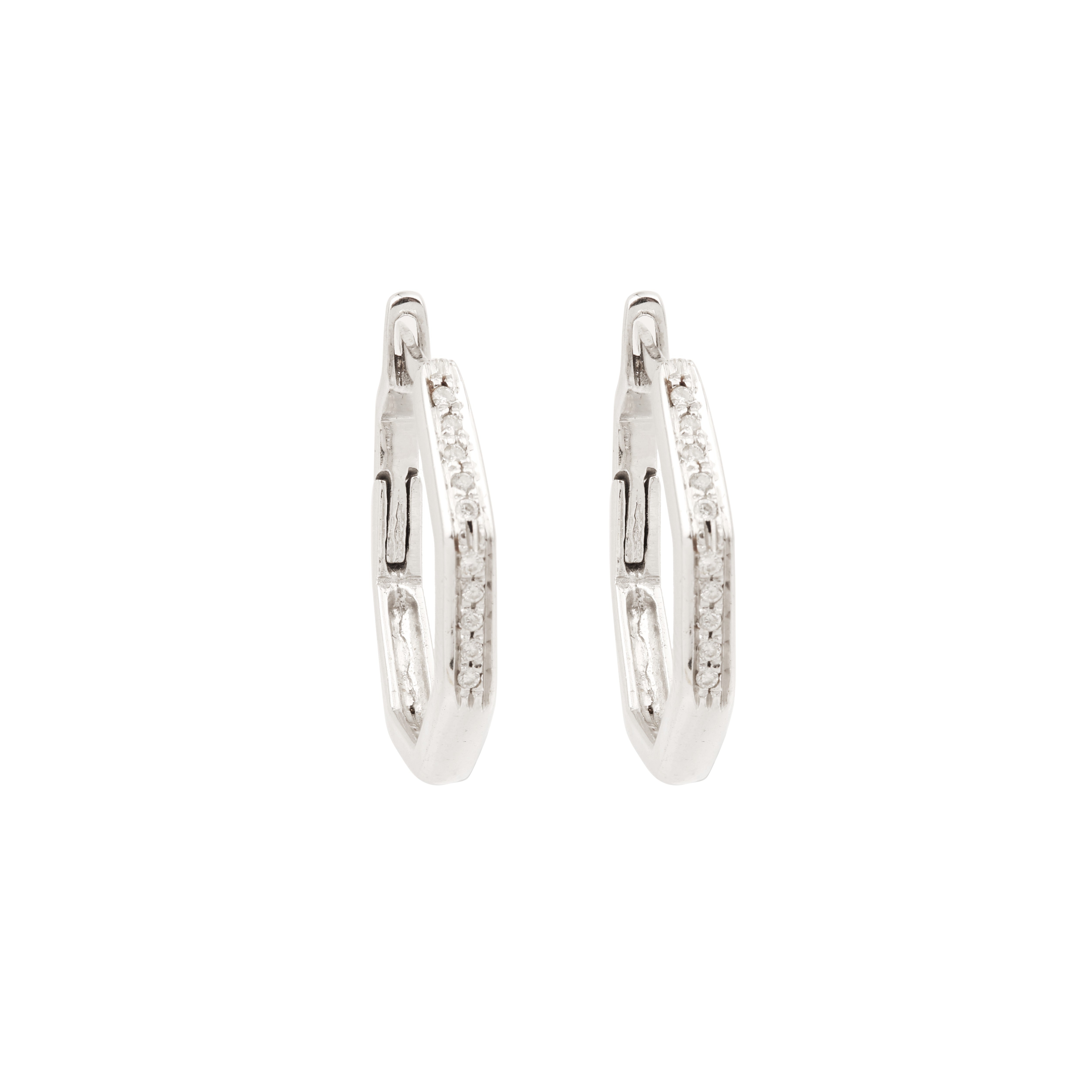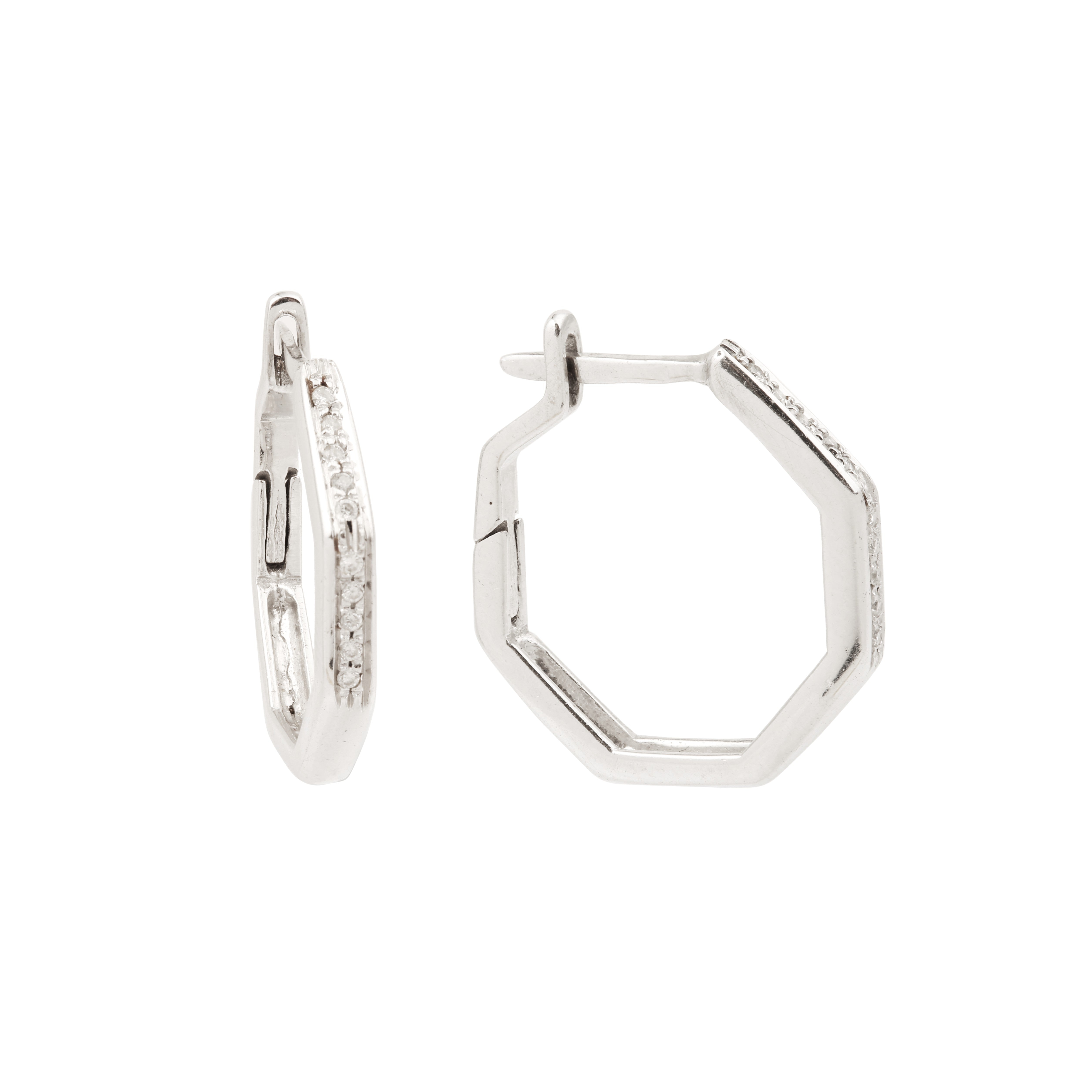 Paire de créoles octogonales en or gris pavées de diamants.